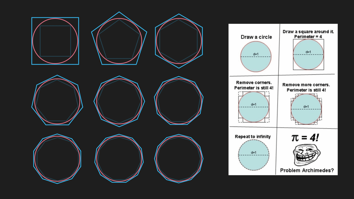 It's unexpected because the method of exhaustion does calculate the perimeter of a circle out of simpler shapes: infinitesimal diagonals approximate the length of a curve, a keystone of calculus from Greek antiquity.