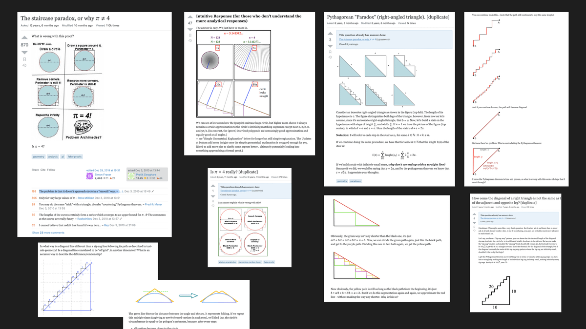 See also years of discussion in the Math StackExchange where the most upvoted question calls it the staircase paradox math.stackexchange.com/questions/12906/the-staircase-paradox-or-why-pi-ne4