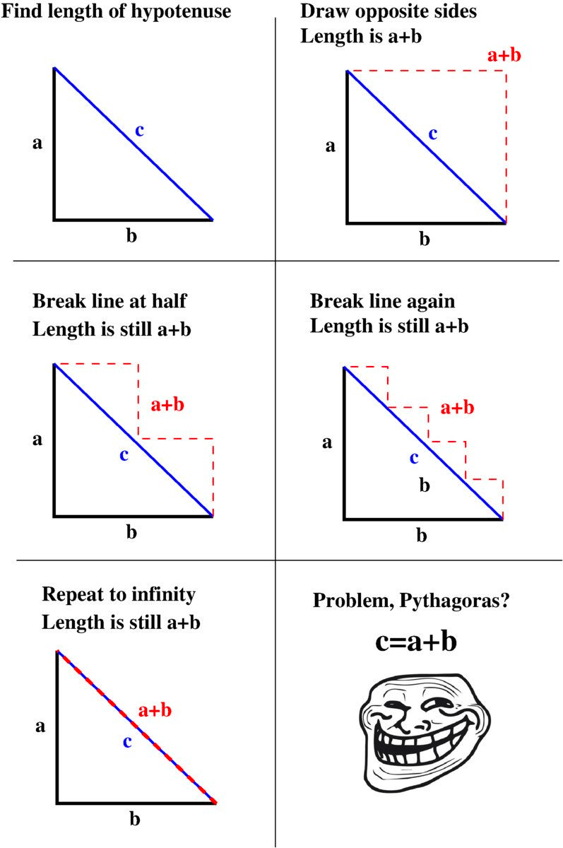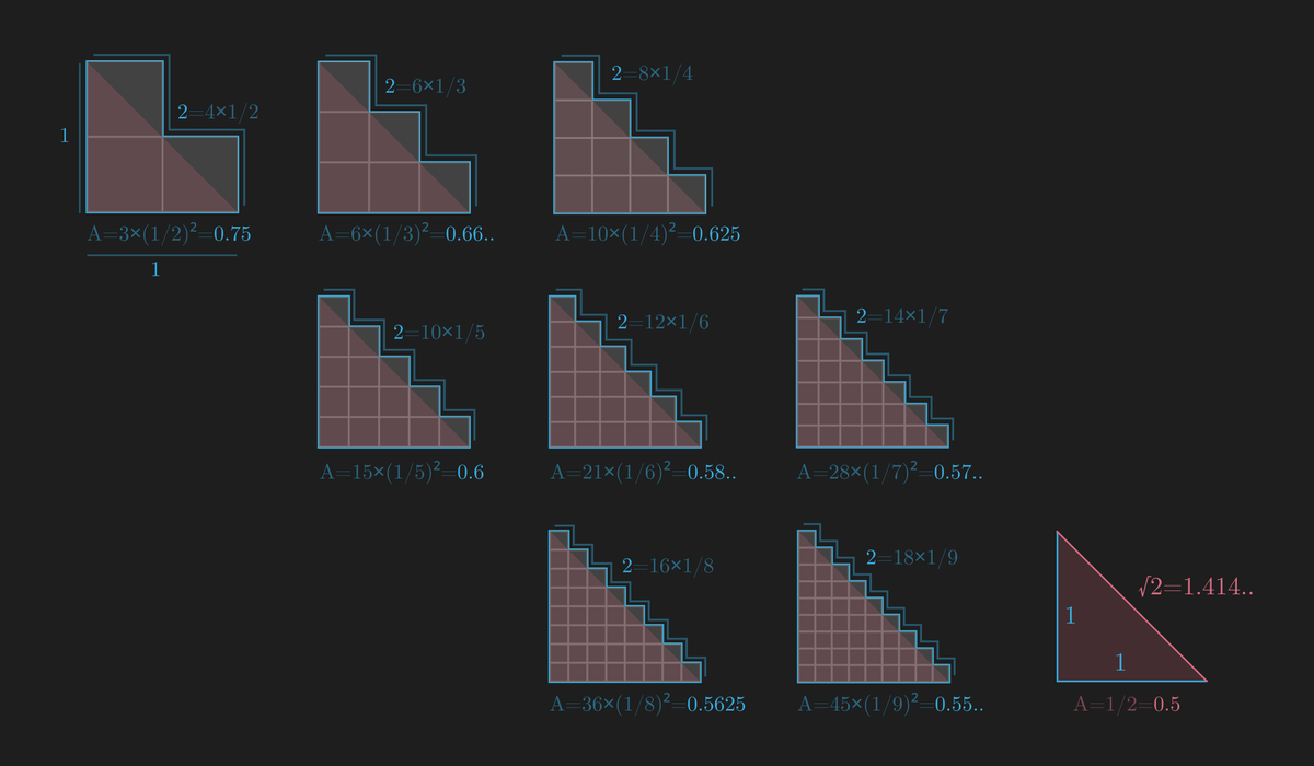 A diagonal isn't just right-angle steps, no matter how tiny. An ever finer staircase converges to the area of the triangle, but NOT to its perimeter —a foundational fractal paradox.