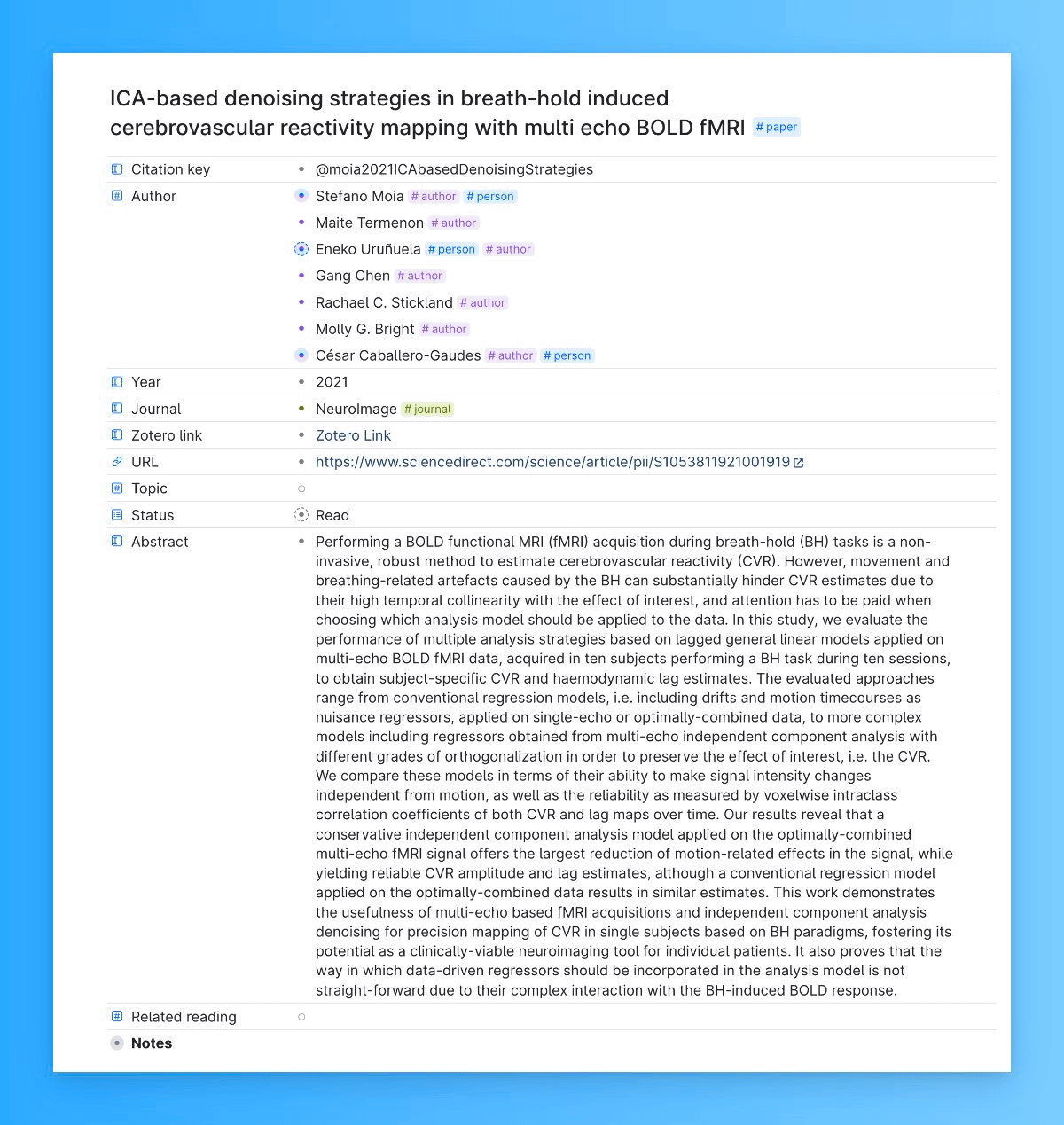 With this template, you can easily import metadata from Zotero, tag papers with "read"/"unread" status, and highlight key quotes in Zotero.