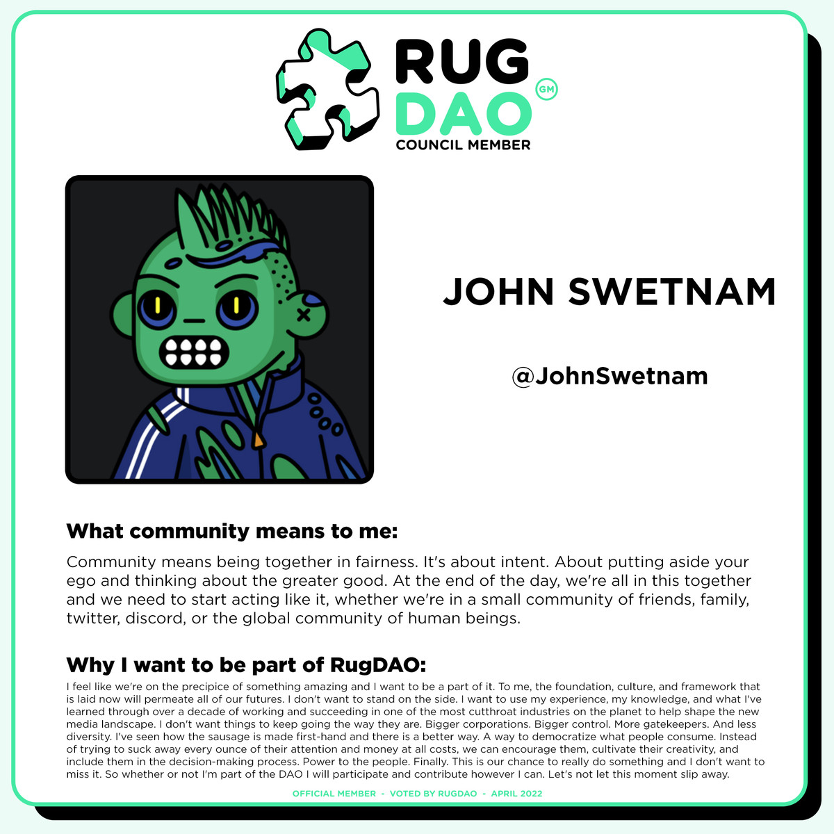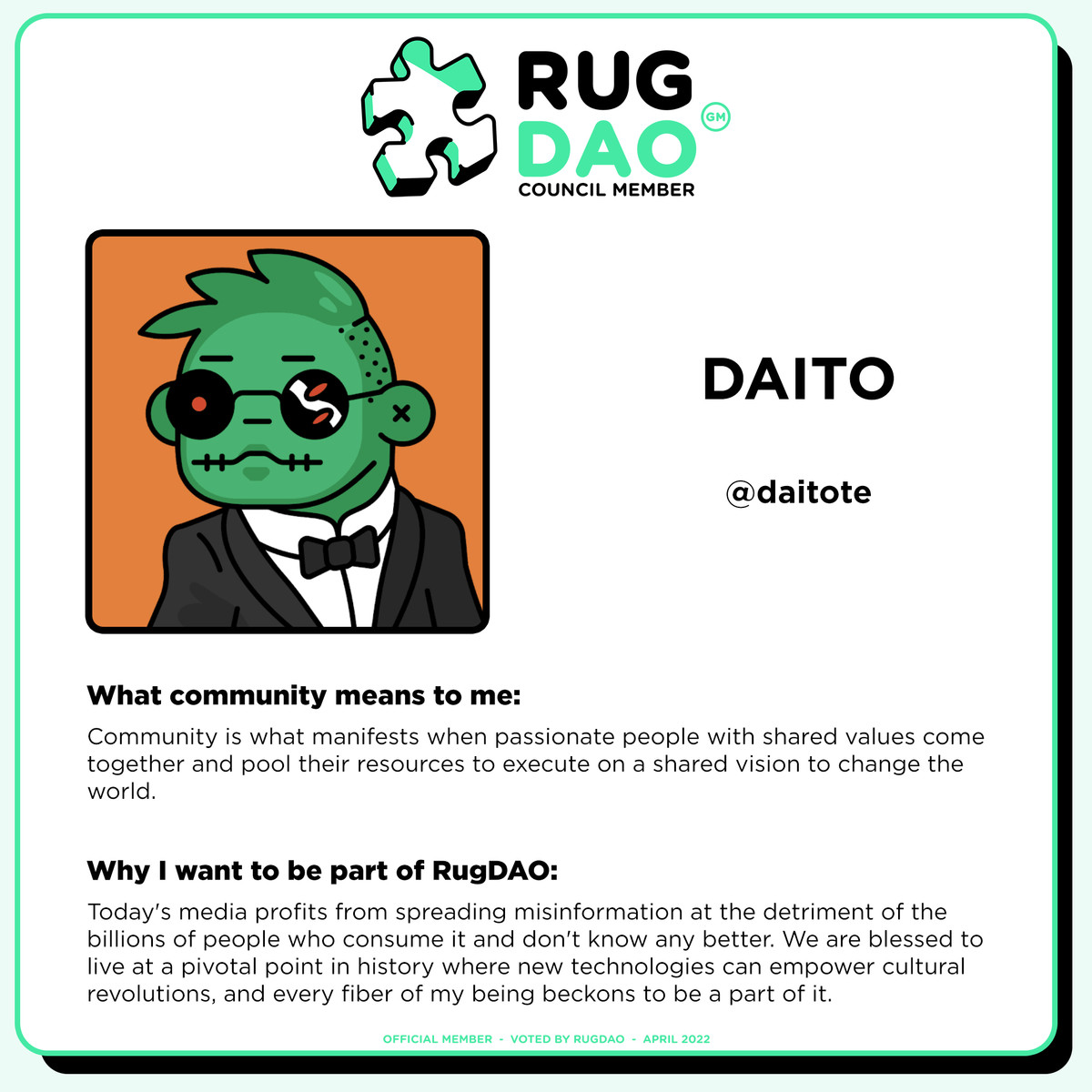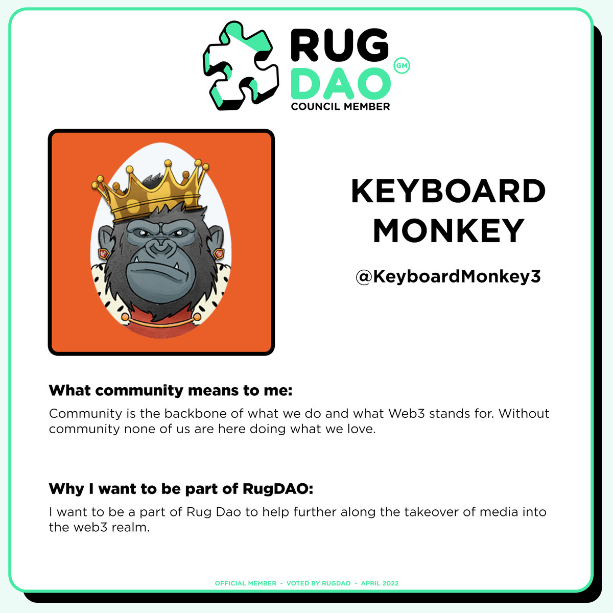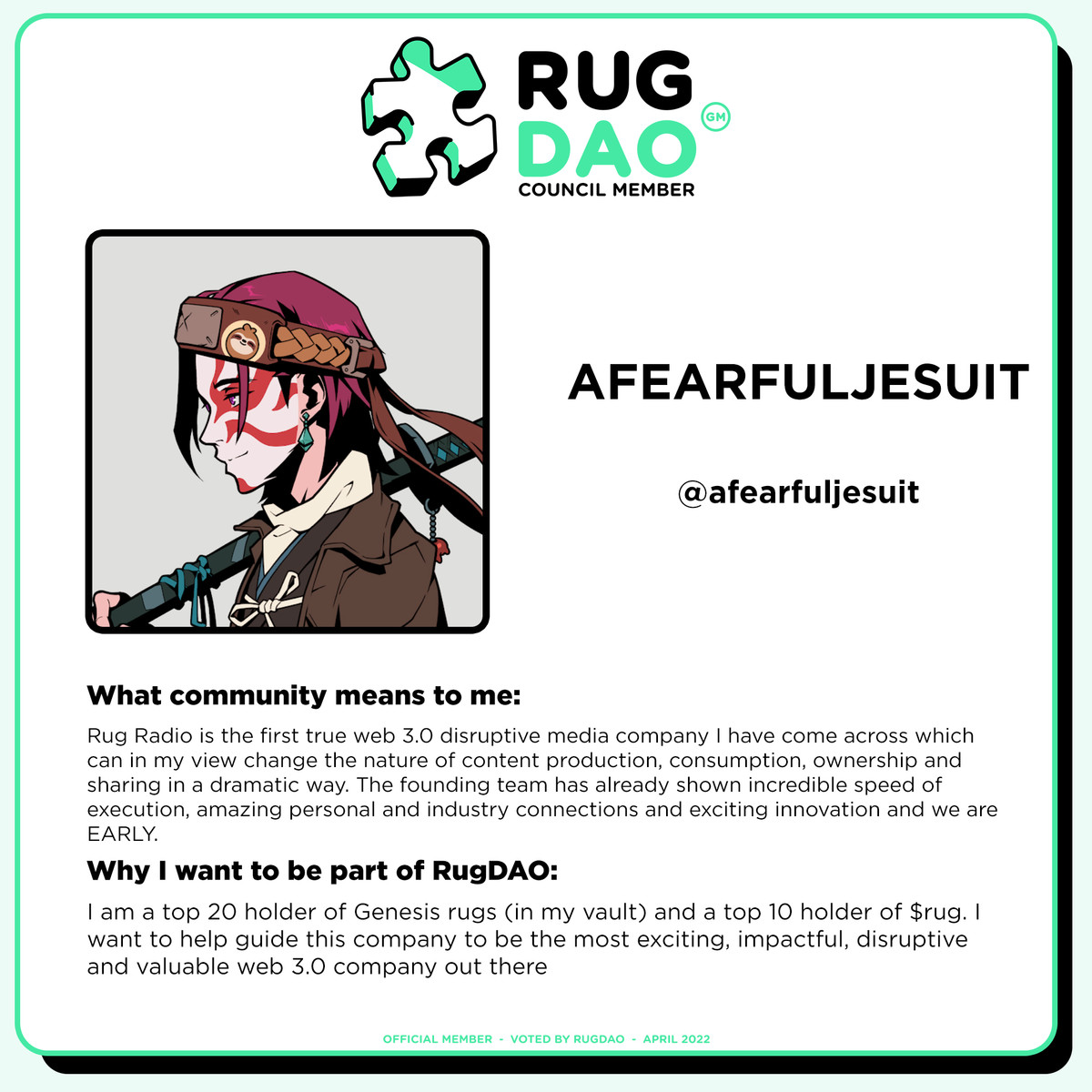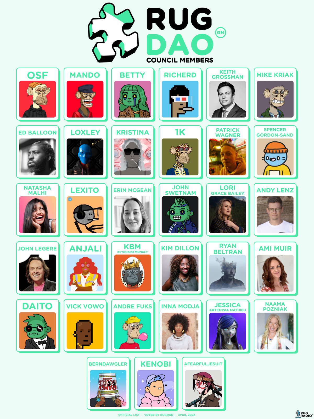 Three months ago, we launched @RugRadio. After releasing 20K Member Passes, 20K Genesis NFTs, a token and a DAO, we are proud to present you all the RugDAO Council, which was formed last week, followed by the launch of $RDAO, thus finalizing roadmap 1.0!
