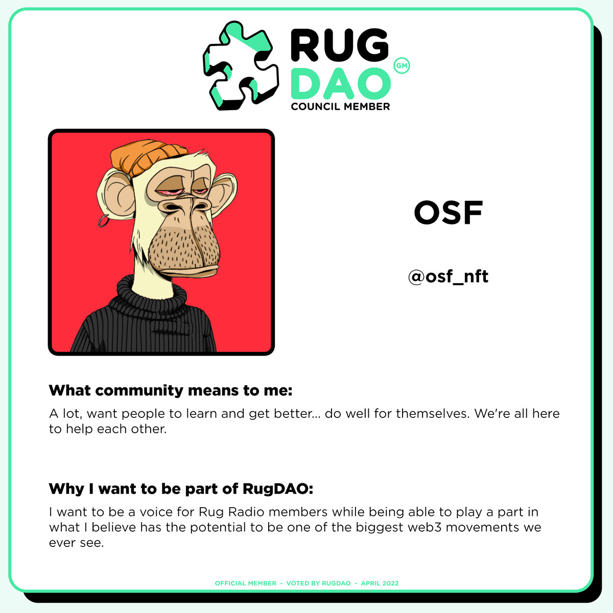 2/ @OSF_NFT has been an avid support of Rug Radio since its inception and one of our largest holders, on top of being one of the most consistent hosts! His experience in TradFi and collecting in Web3 will help us a lot.