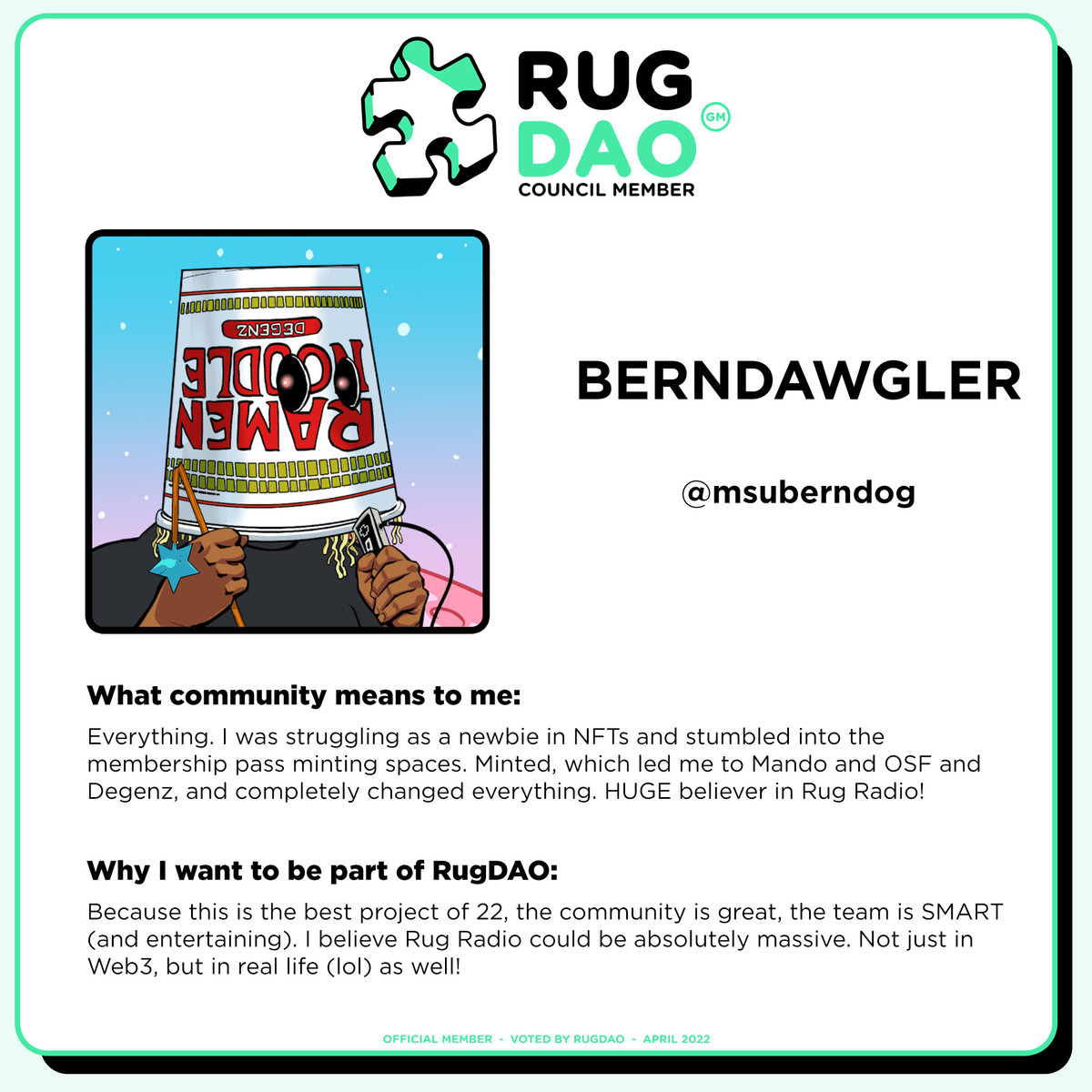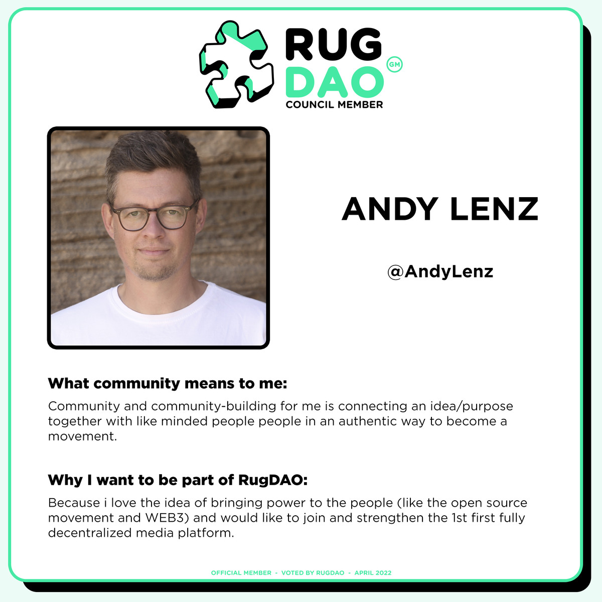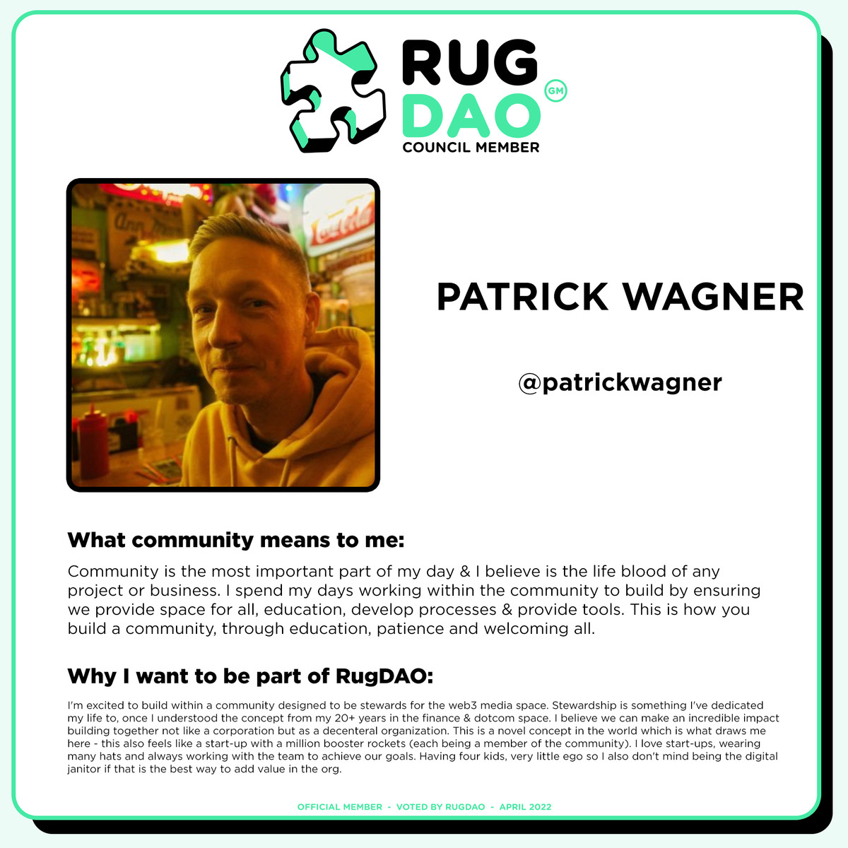 16/ @PatrickWagner, one of our first ever hosts on Rug Radio and a great figure of inclusivity in the space. On top of being an entrepreneur for close to 30 years, Patrick's expertise is building teams and departments will be of great help to the DAO.