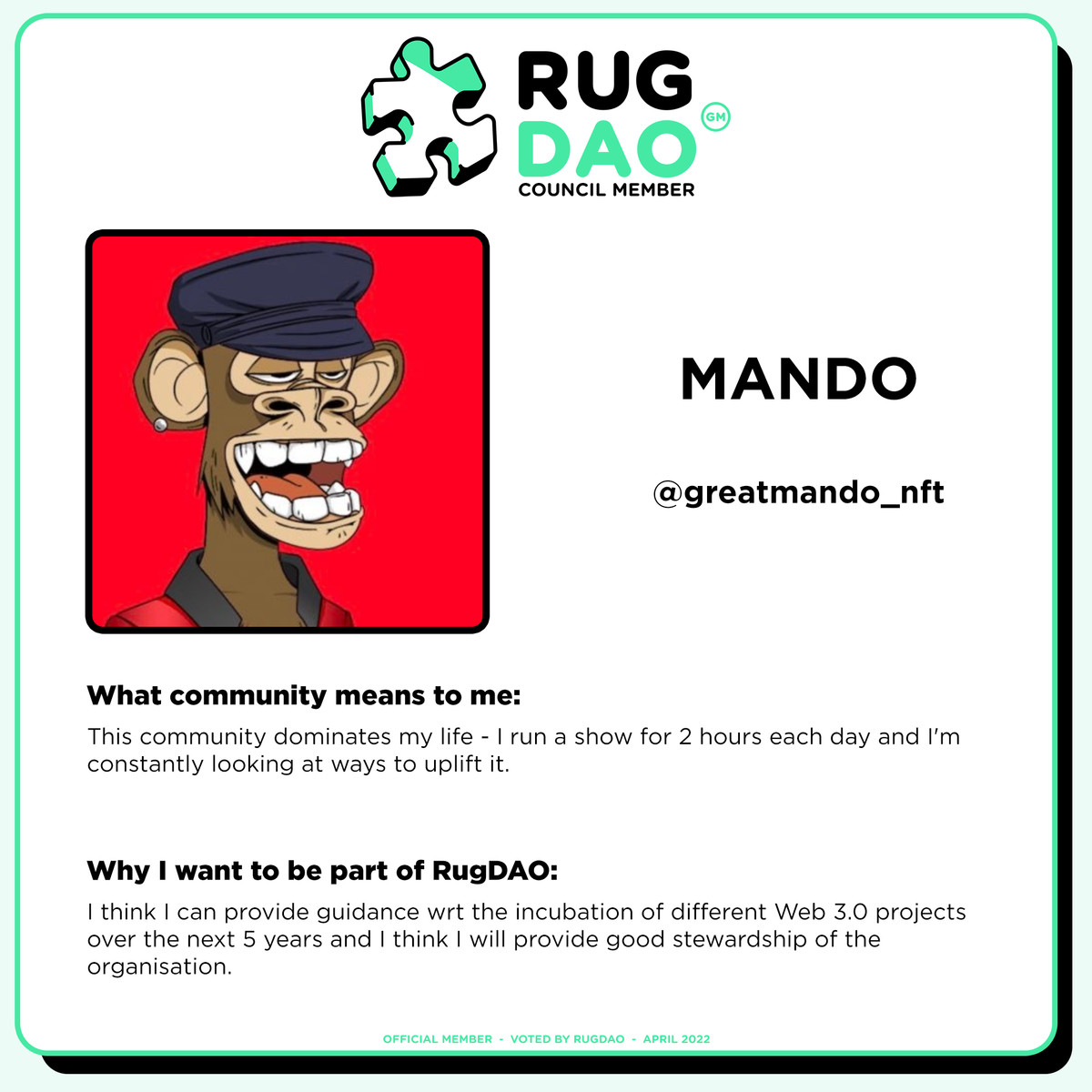 3/ @GreatMando_NFT has an incredible collection alongside his partner OSF with whom he has worked for years now, co-hosts the "gm NFTs โ๏ธ" show with us every morning, and has great ideas to bring to the RugDAO and its community!