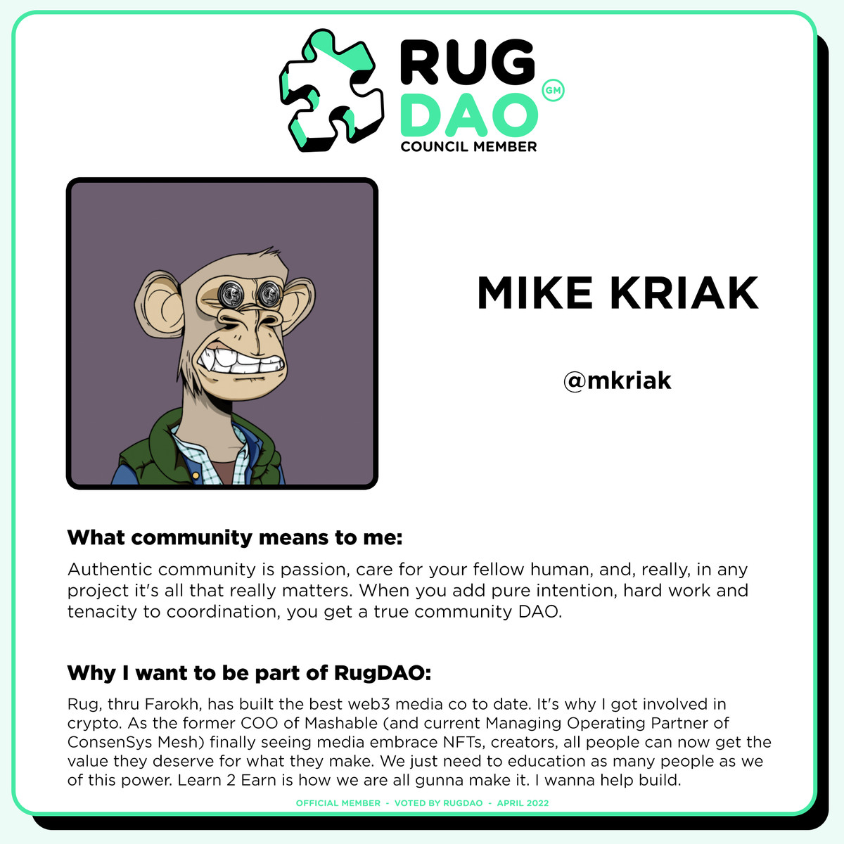 10/ @Mkriak, Managing Operating Partner at ConsenSysMesh, an accelerator and incubator of blockchain technology solutions, and former COO of Mashable. The titles speak for themselves, but having Mike is specifically great because he has a lot of DAO experience as well!
