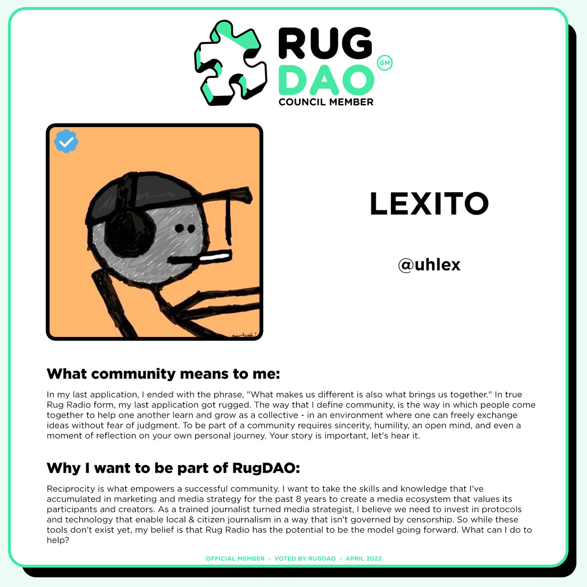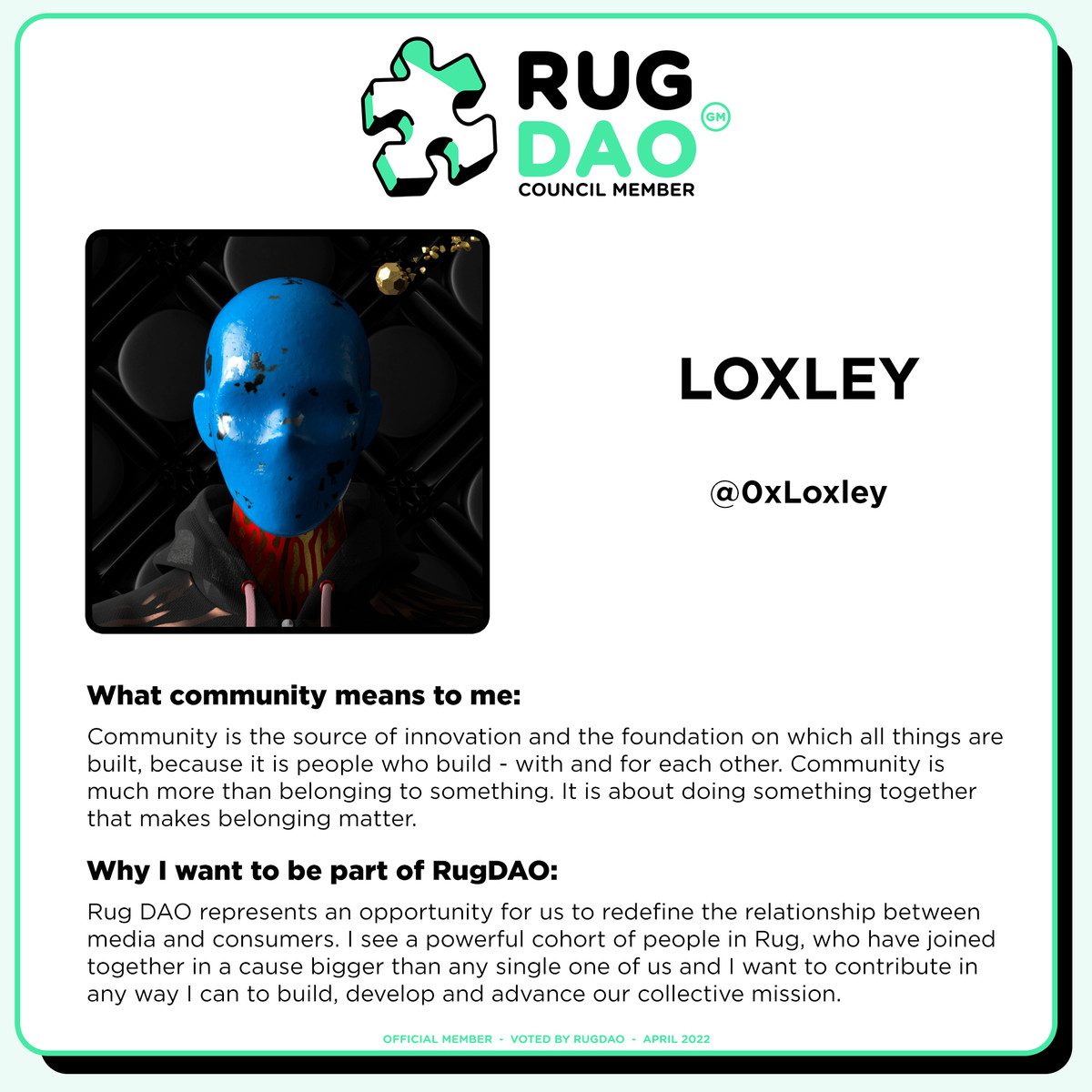 14/ @0xLoxley, a fellow community member who found out about Rug Radio early on and became a very big supporter amongst friends and partners! Loxley has been very active in our Discord and on Twitter but also stepped up when we needed dev help for our voting platform. Thank you!