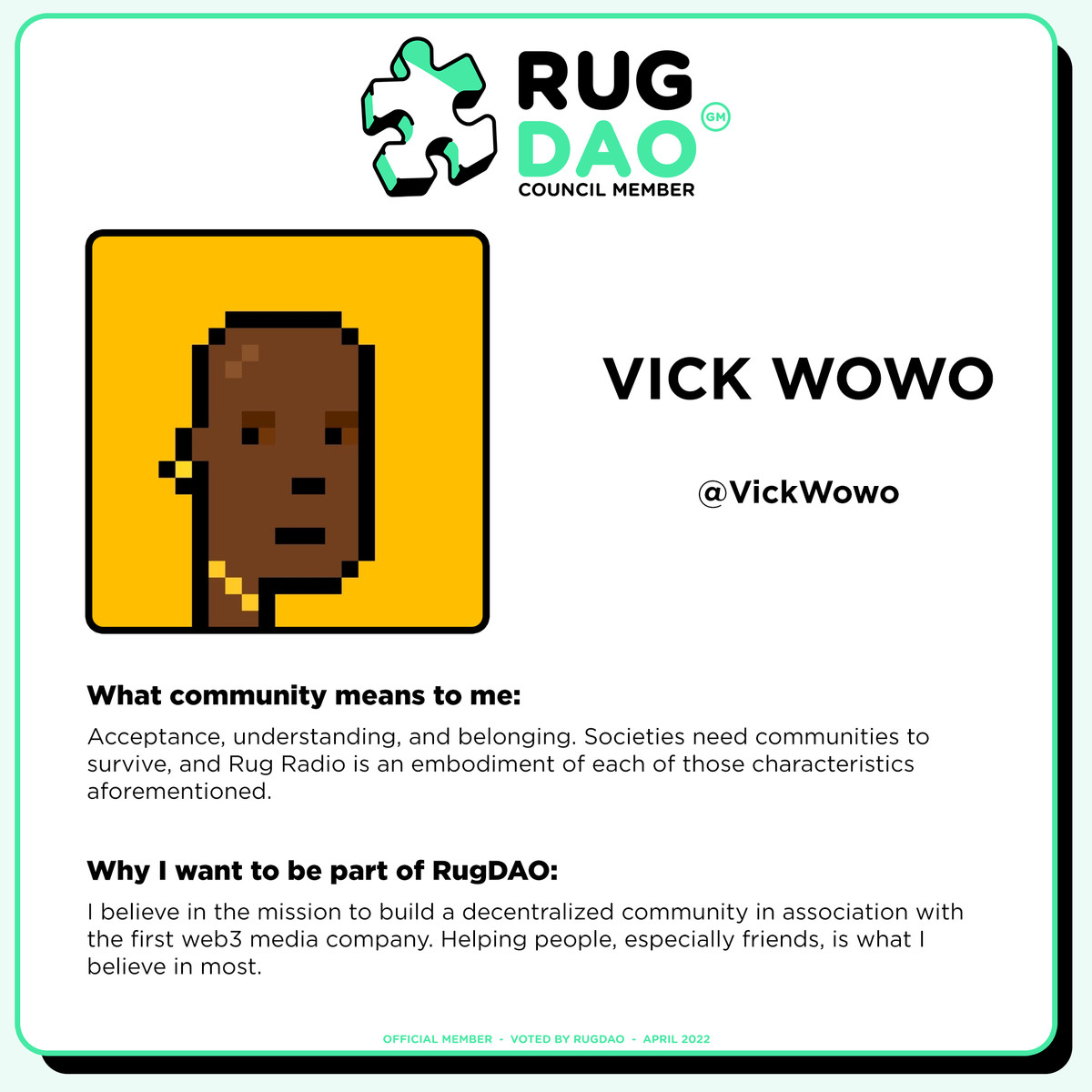 27/ @VickWowo works in Sports & NFT Strategy at Microsoft, he brings a technology executive point of view to the Web3 communities he is a part of today and has been a very long time supporter of Rug Radio and I!