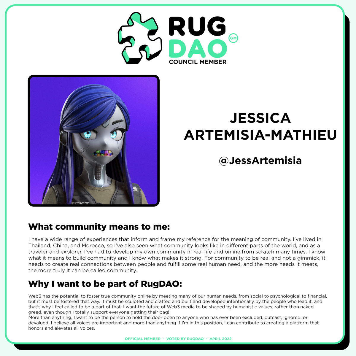 28/ @JessArtemisia is a community MVP and one of our Discord mods who aligned with our vision and spends a lot of time helping the Rug Radio community and making sure things are organized and that people are heard and answered to.