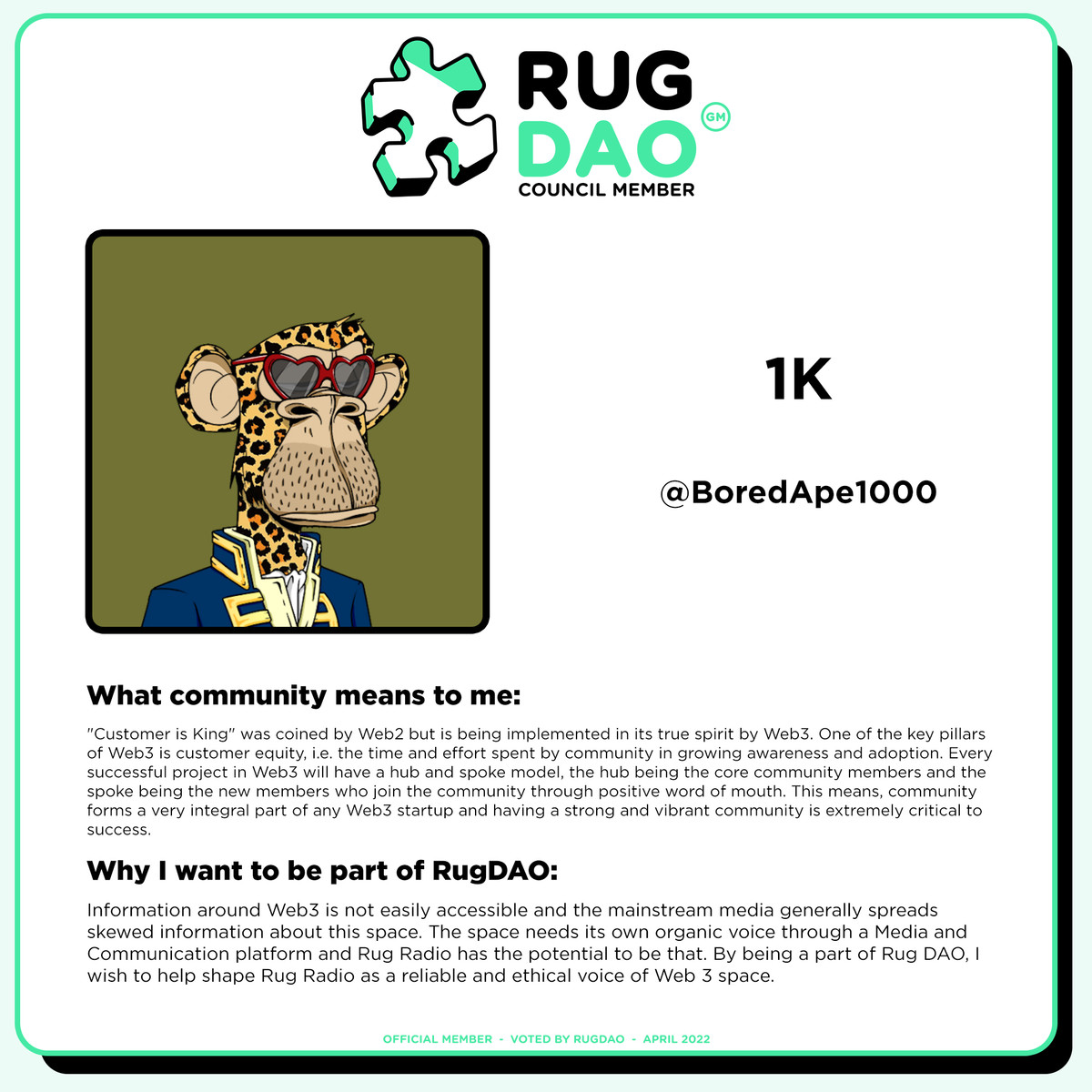 15/ @BoredApe1000, one of Rug Radio's largest holders and supporters! As a Managing Partner of a Fortune 500 company, 1K helped create and implement go-to-market strategy and business development and growth in the past.