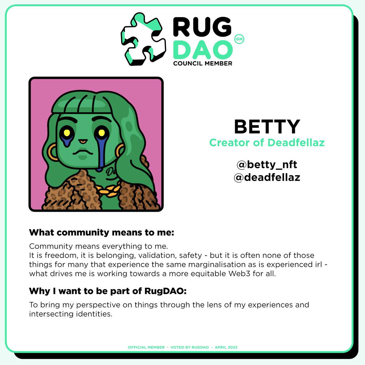 4/ @BETTY_NFT co-founded the Deadfellaz with her husband Psych, a collection that has done over 26K ETH in volume so far, and that is one of the most recognizable brands in the NFT space today. Not only that, but Betty is an important and prominent female voice in the space!