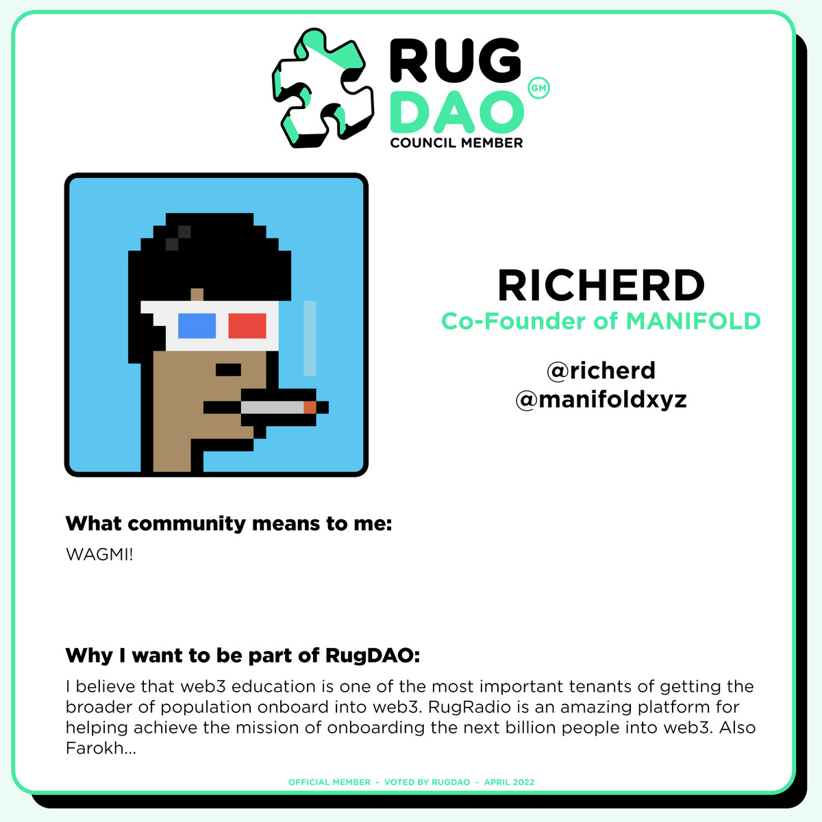5/ @Richerd, the man, myth and legend who co-founded Manifold, one of the most important companies in the Web3/NFTs space today. Richerd is one of the top experts when it comes to smart contracts, tokens, and is actively empowering artists to become their own platforms!