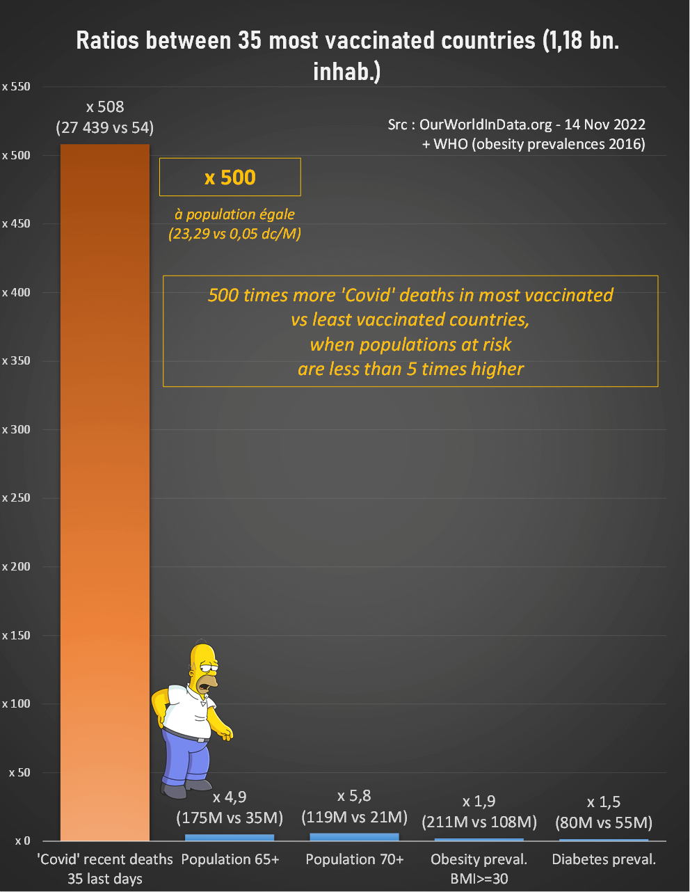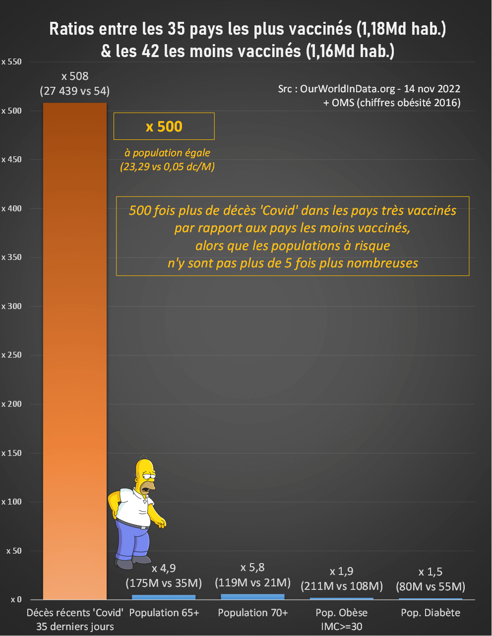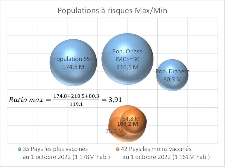 En prenant le cas extrême (et absurde) où les différentes populations à risque seraient distinctes pour les Vax+ et confondues pour les Vax-, on trouve un ratio max… inférieur à 4.
