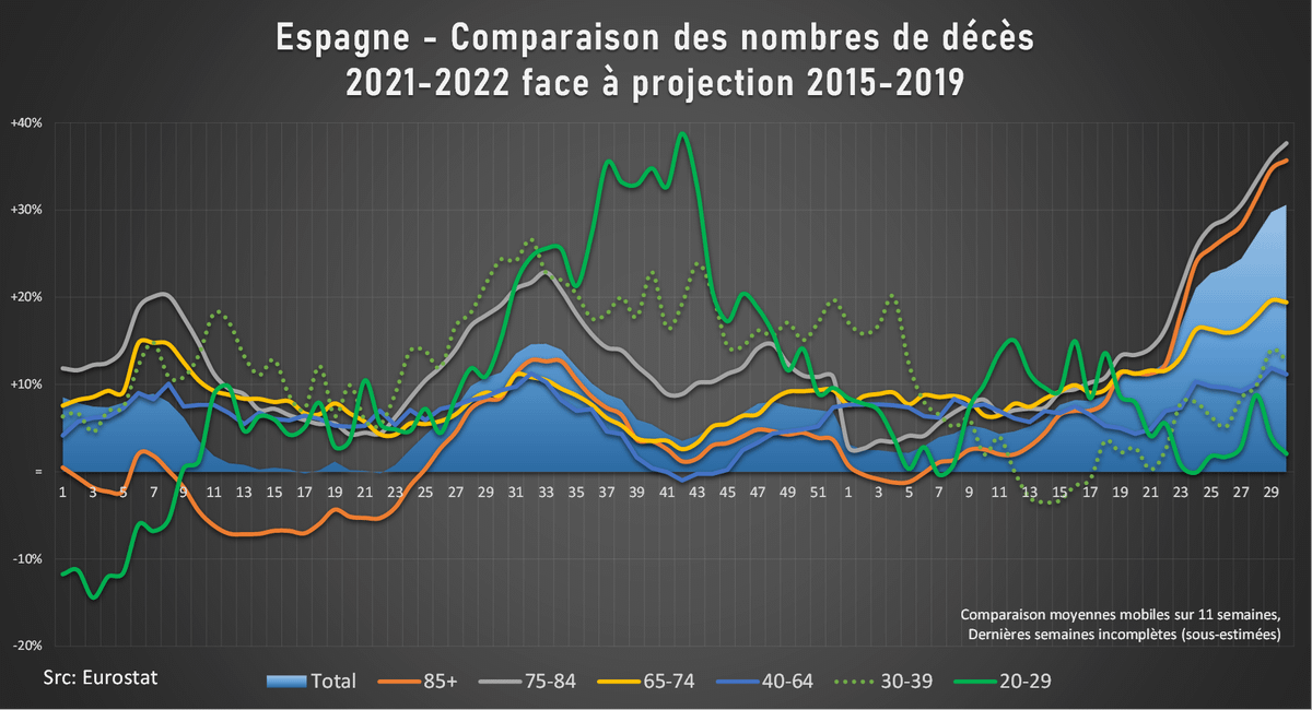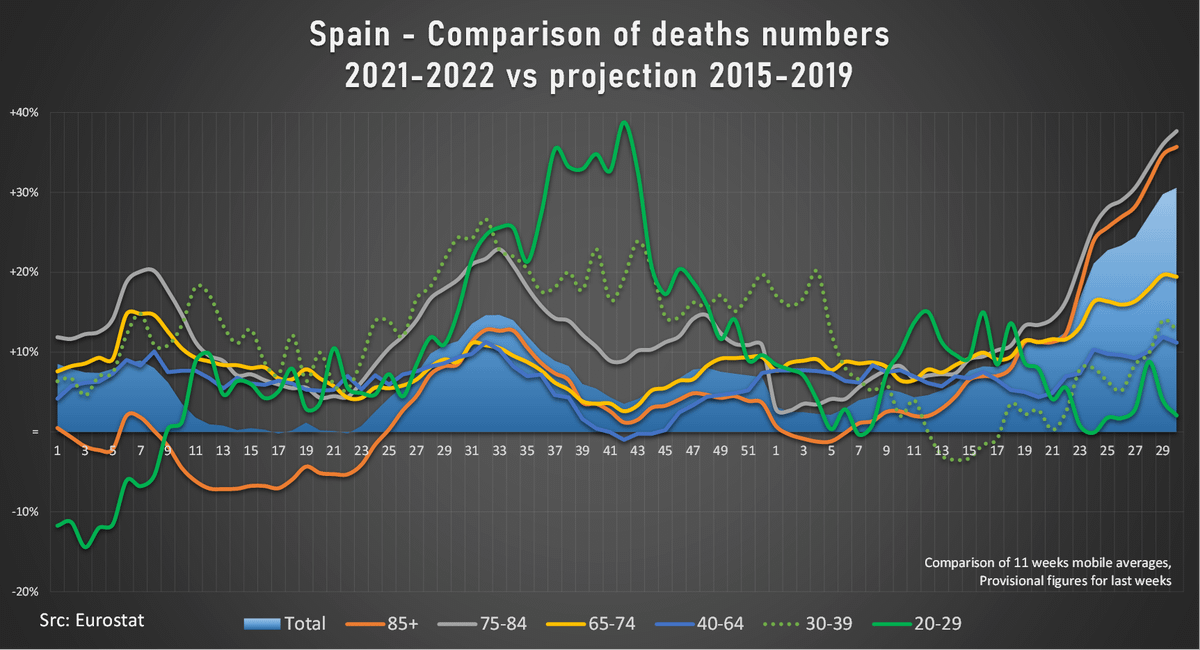 🇪🇸 #Espagne 1. La surmortalité toutes causes atteint des sommets dans les chiffres d'@EU_Eurostat. La vaccination, citée partout en exemple (~100% des personnes à risque), n'avait pas empéché une forte surmortalité estivale en 2021. Alors que dire de celle de 2022 ?