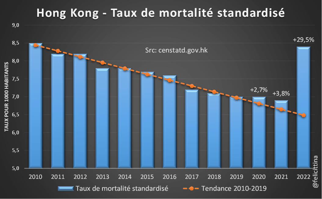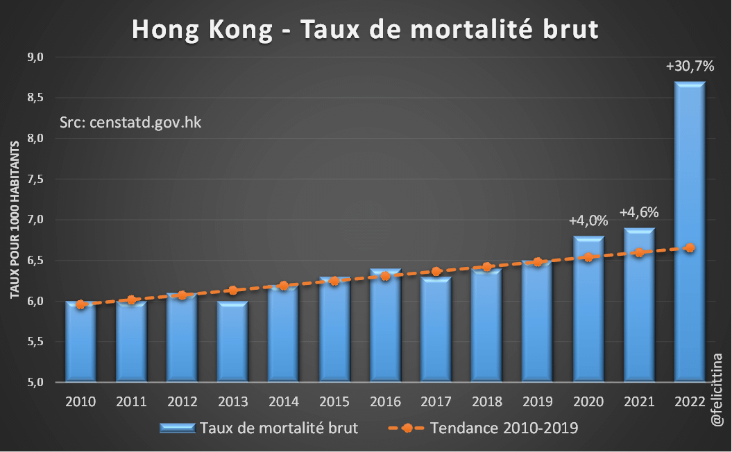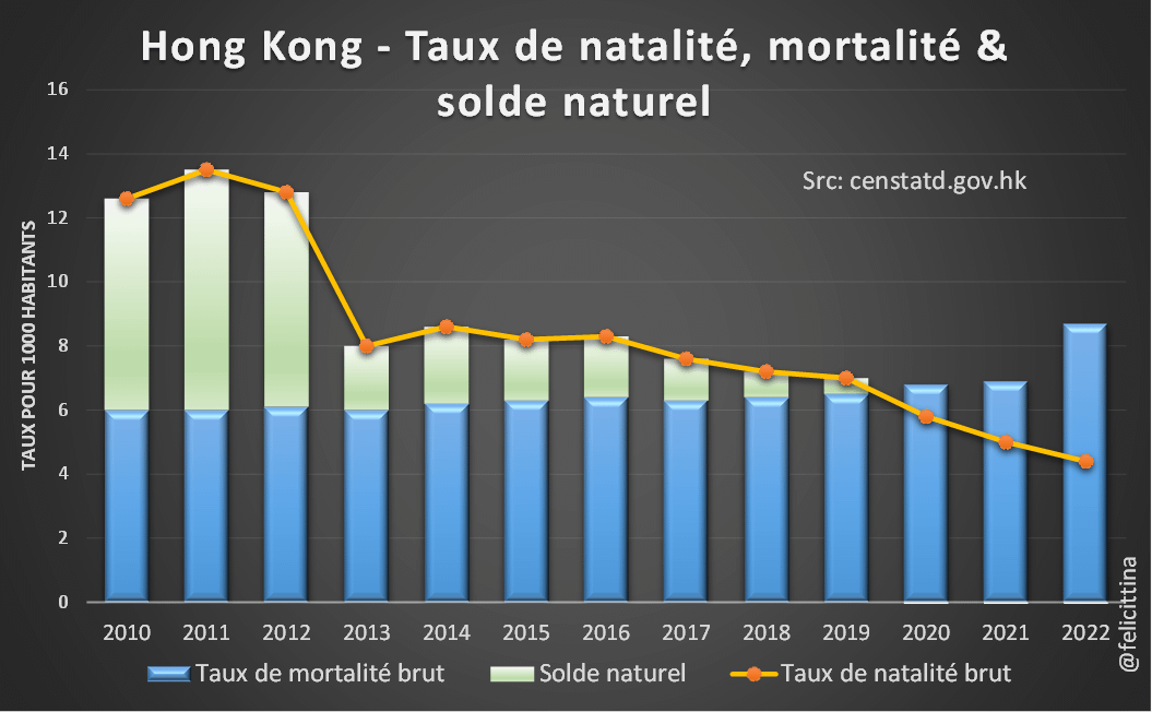 Hong Kong a connu en 2022 pratiquement 2 décès pour 1 naissance (63,7k/32,5k).