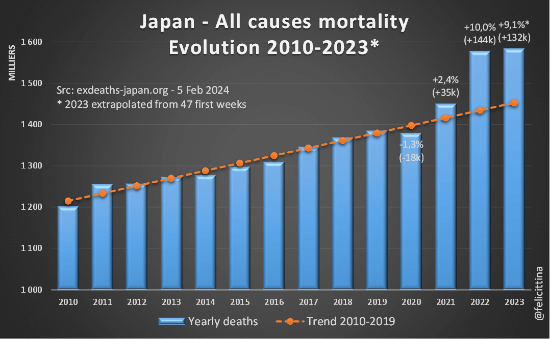 [NB: Extrapolation for 2023 is done by dividing the partial total, over 43 weeks, by the mortality of the first 47 weeks over the period 2010-2019 and multiplying by the mortality over 52 weeks over this same period]