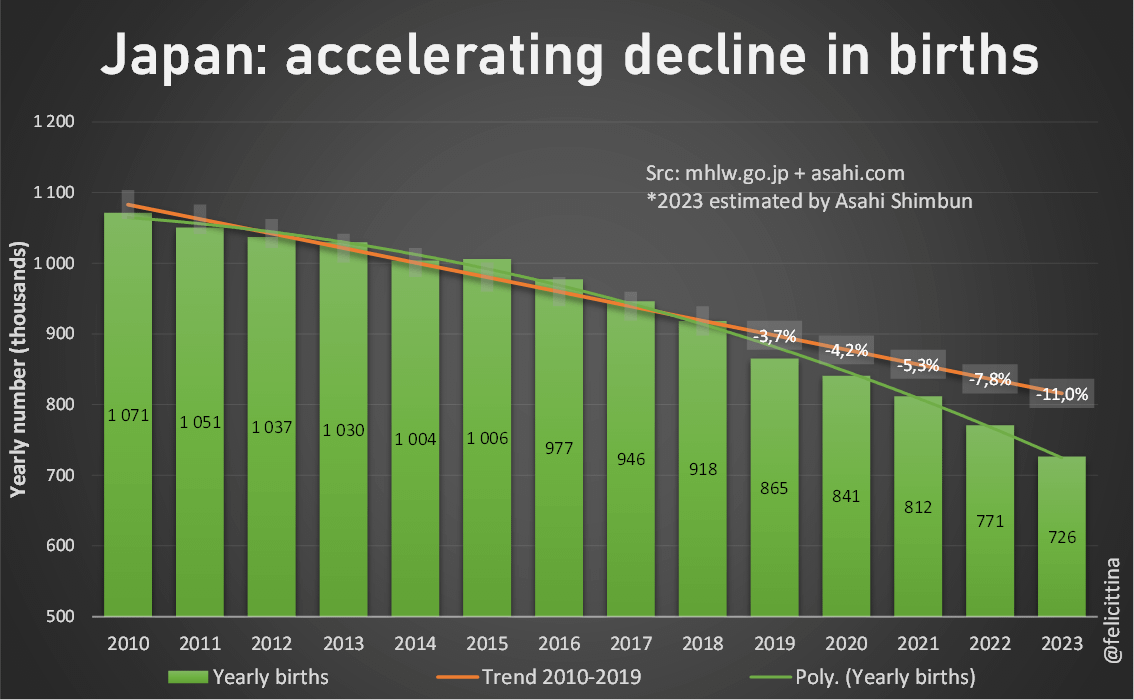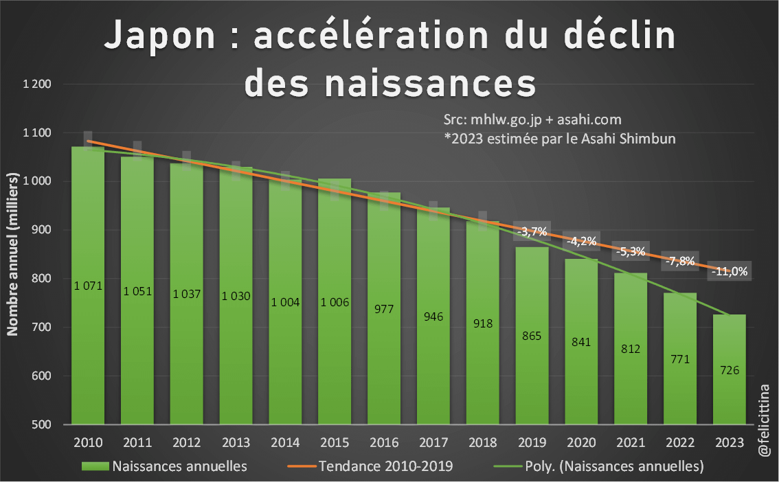 Pour 2023, j'ai du me contenter de cet article du @asahi qui donne une estimation qu'on peut supposer basée sur des chiffres officiels (mais introuvables sur les sites gouvernementaux).