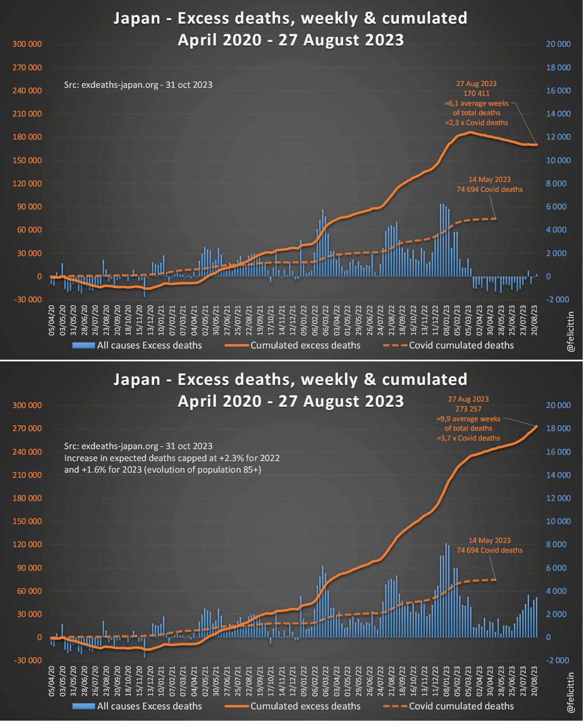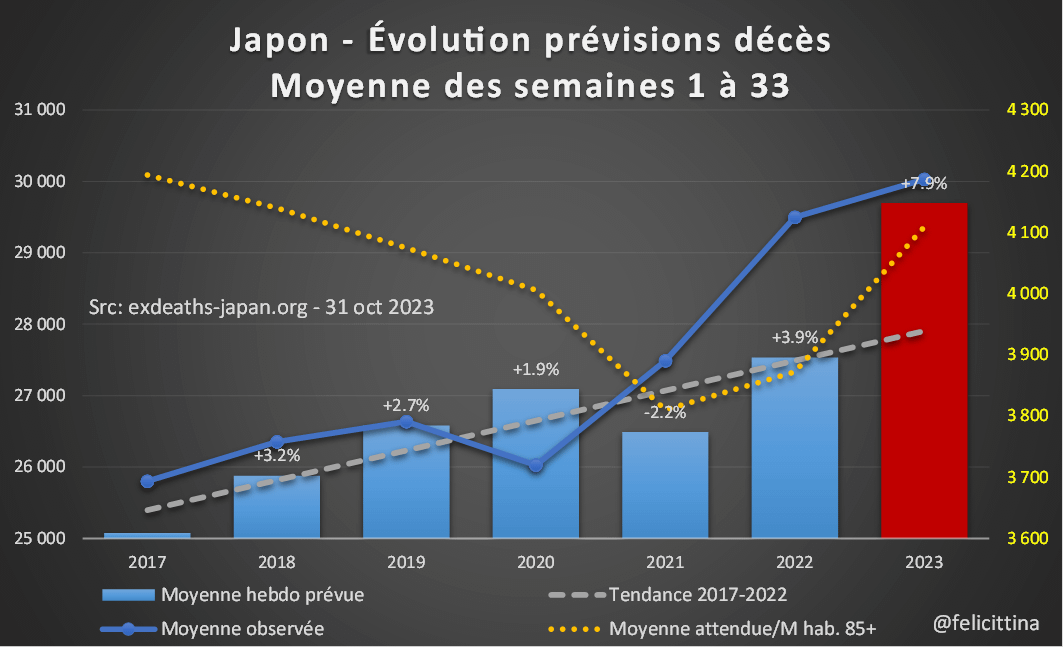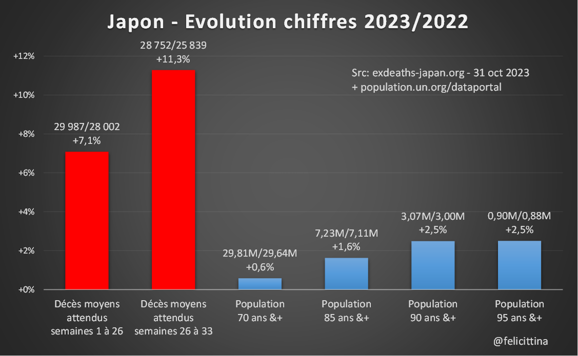 🇯🇵 #Japon Le site exdeaths-japan.org/en continue à baser ses calculs de #surmortalité 2023 sur des prévisions de + en + exagérées du nombre de décès attendus. Après +7,1% "attendu" pour le 1er semestre 2023, on atteint +11,3% pour les 8 premières semaines de ce semestre. [1/8] twitter.com/felicittina/status/1708404391911510259