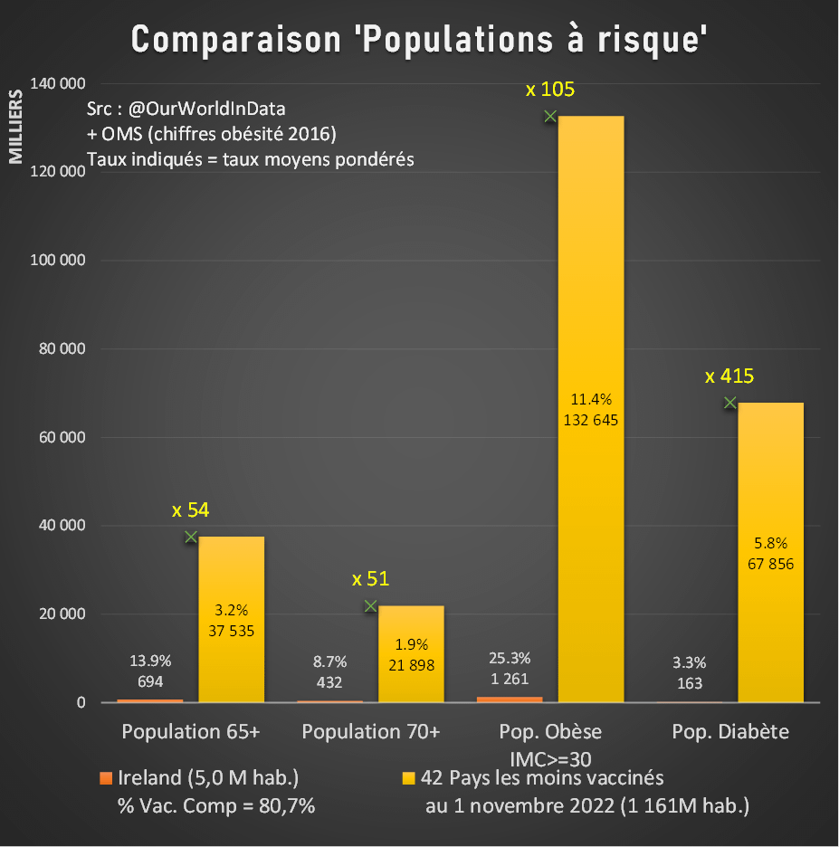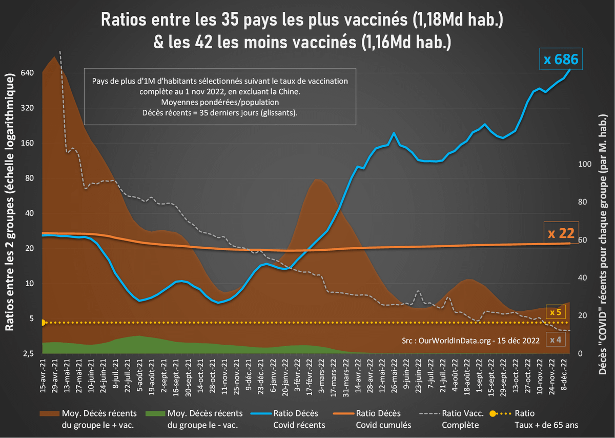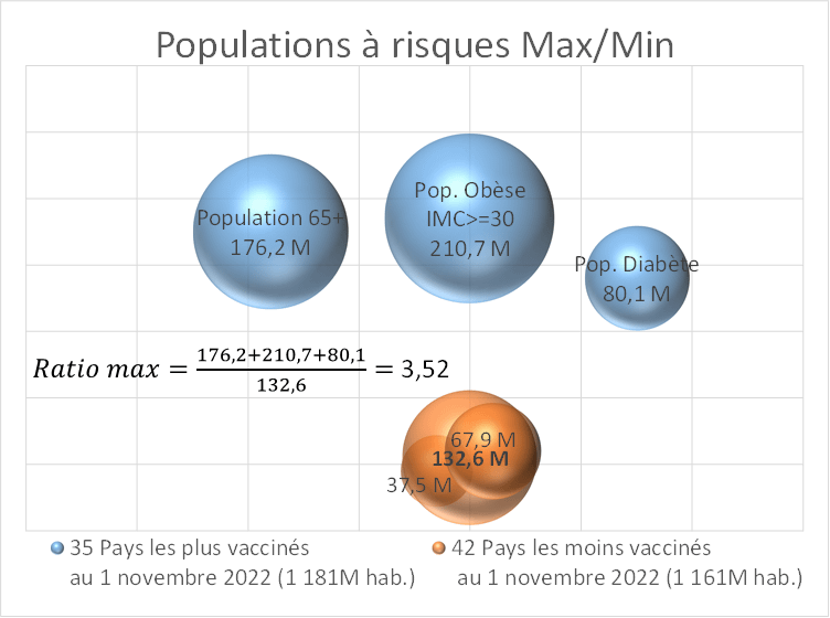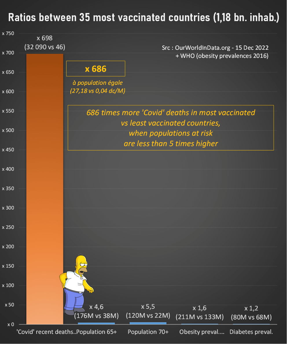 Mais non, prenons le cas extrême (et absurde) où les différentes populations à risque seraient distinctes pour les Vax+ et confondues pour les Vax-, on trouverait un ratio max… inférieur à 4.