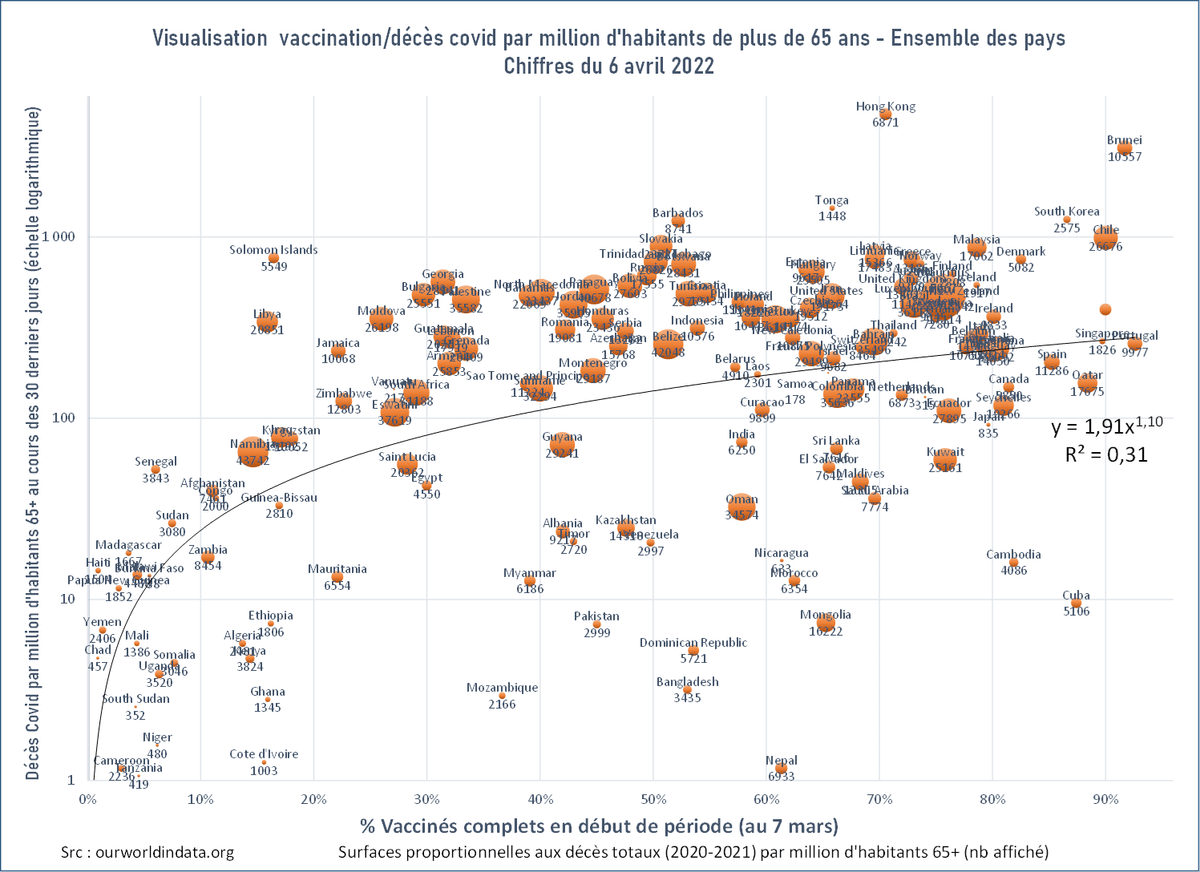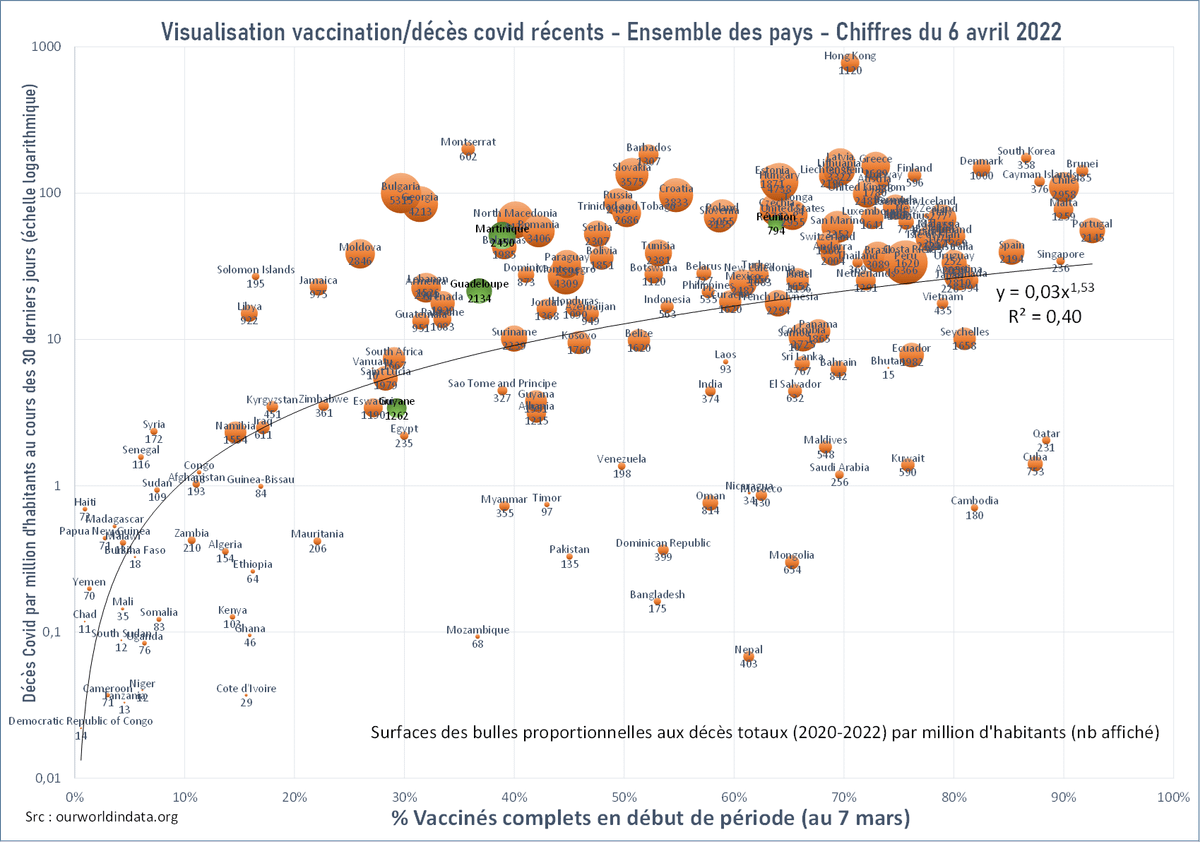 4. Mais quand on prend une vue pour l'ensemble des pays de la planète, pour les décès covid des 30 derniers jours, les bénéfices apportés par le vaccin ne sautent pas vraiment aux yeux, non plus…