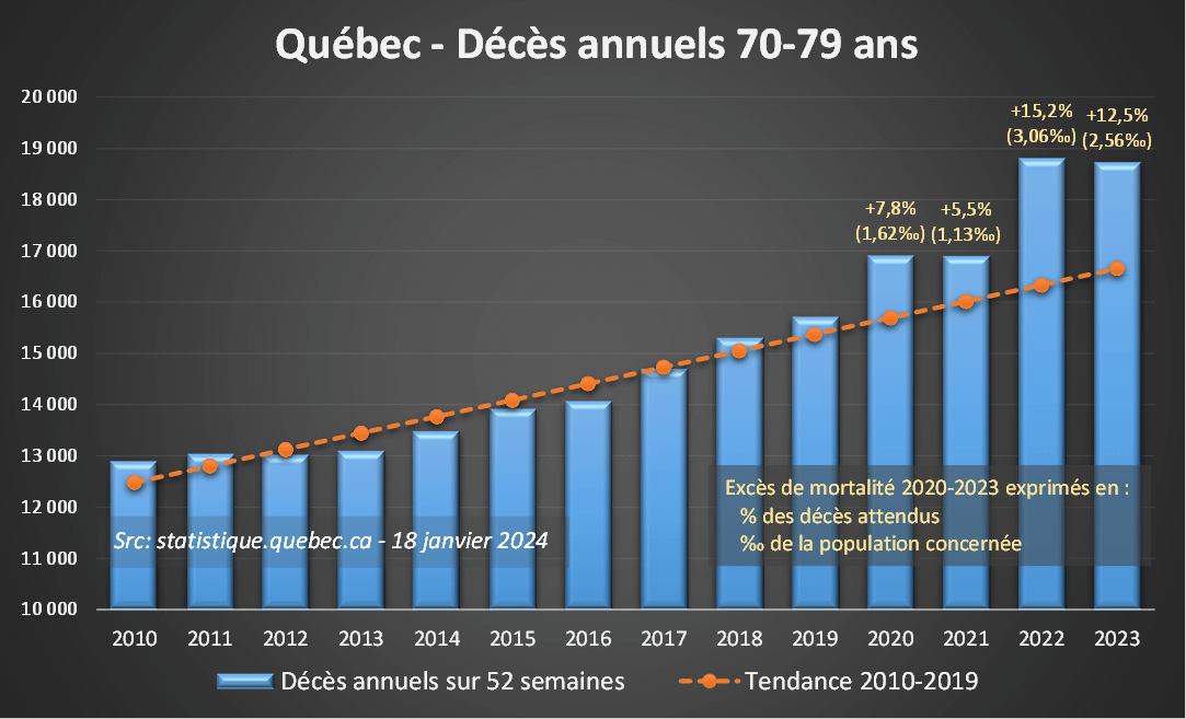 Par contre, pour les 70-79 ans, la surmortalité (moindre en %) concerne 2,56‰ de la tranche (2k/811k), soit 15 fois +, en proportion.
