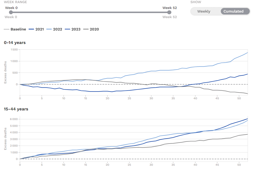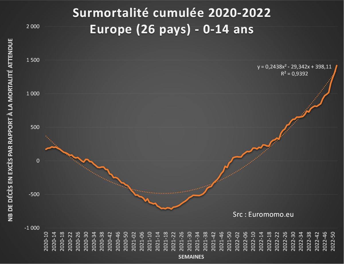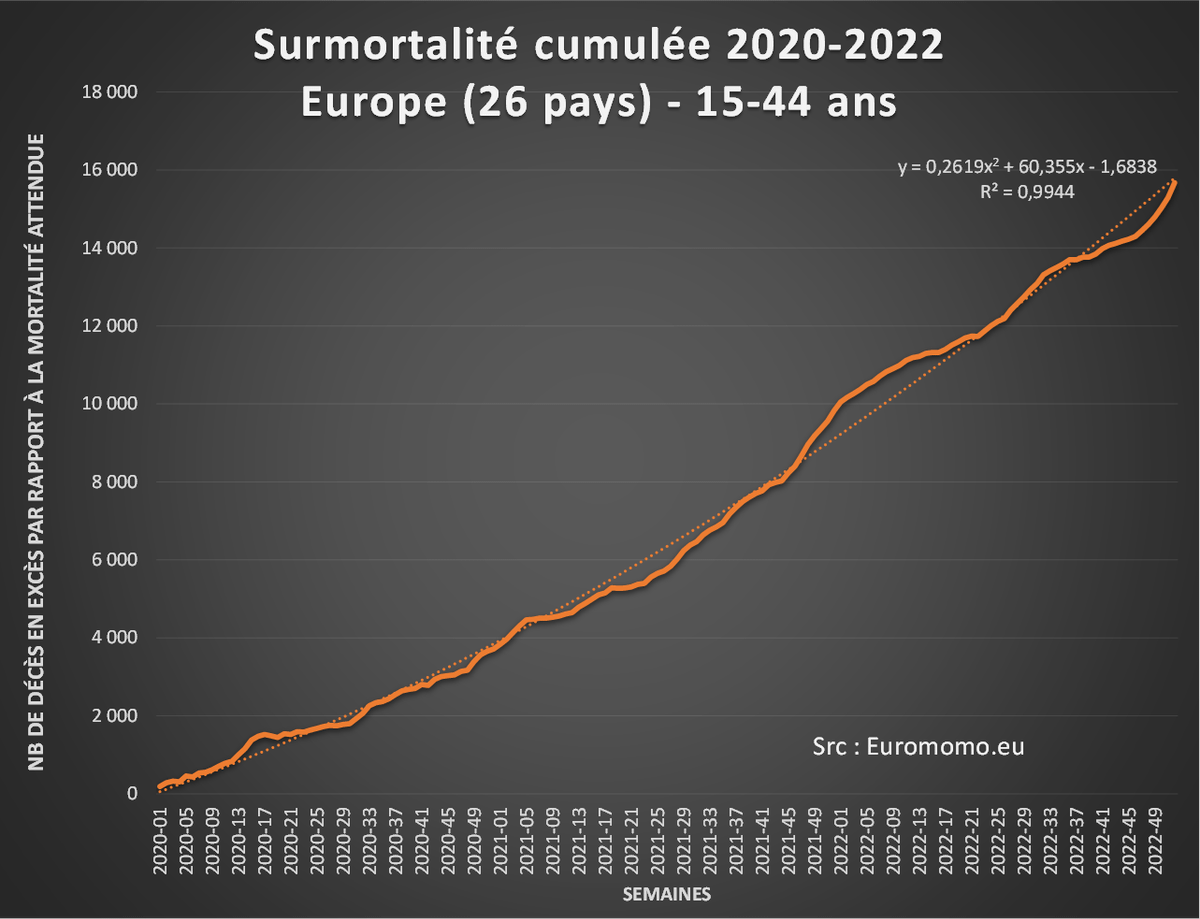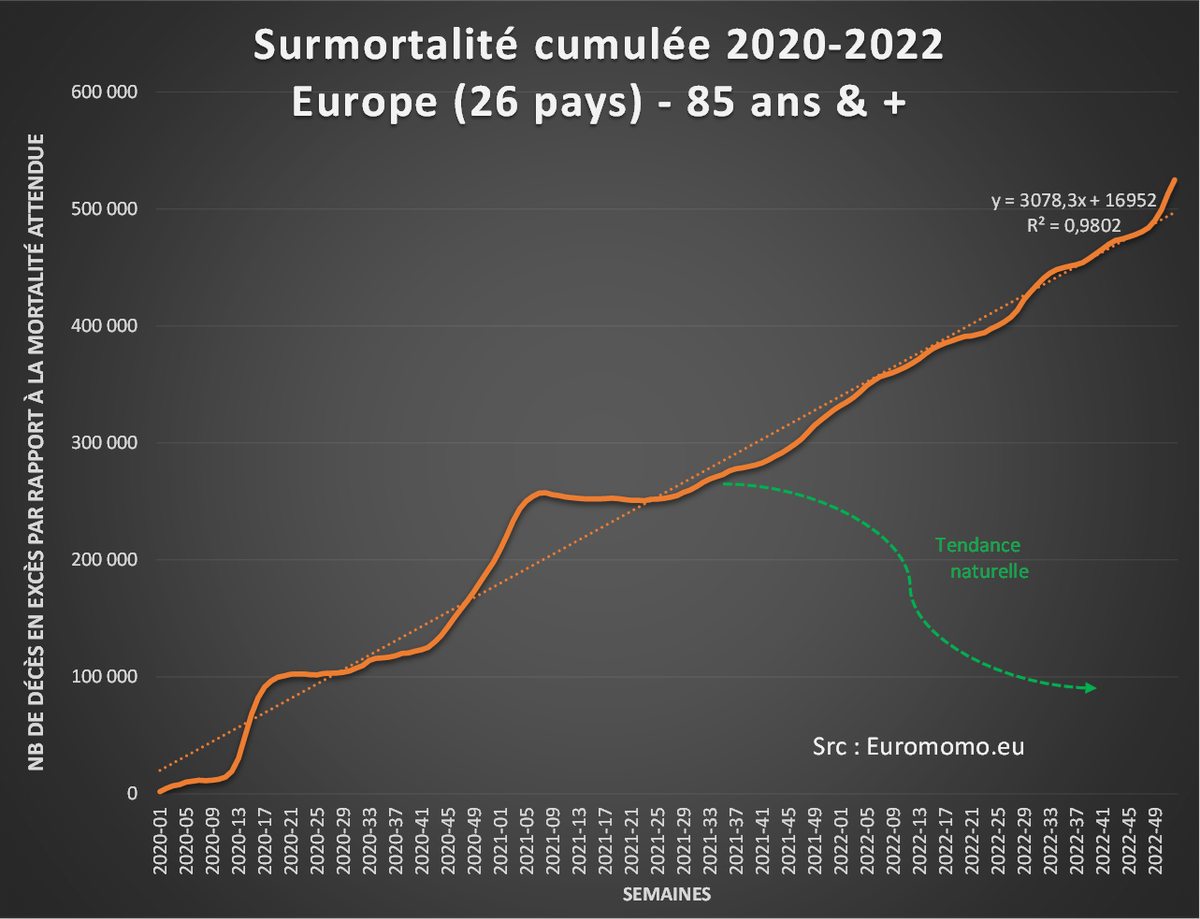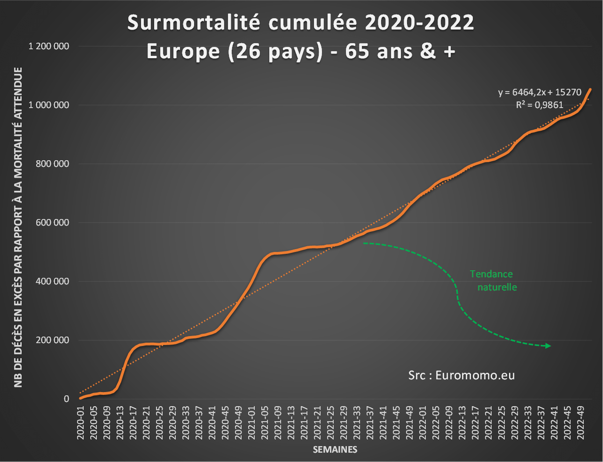 1. Au milieu de cette courbe de la surmortalité européenne cumulée depuis 2020, on est supposé voir une inflexion radicale grâce à la merveilleuse techno ARNm, "sauveuse de millions de vies" ?