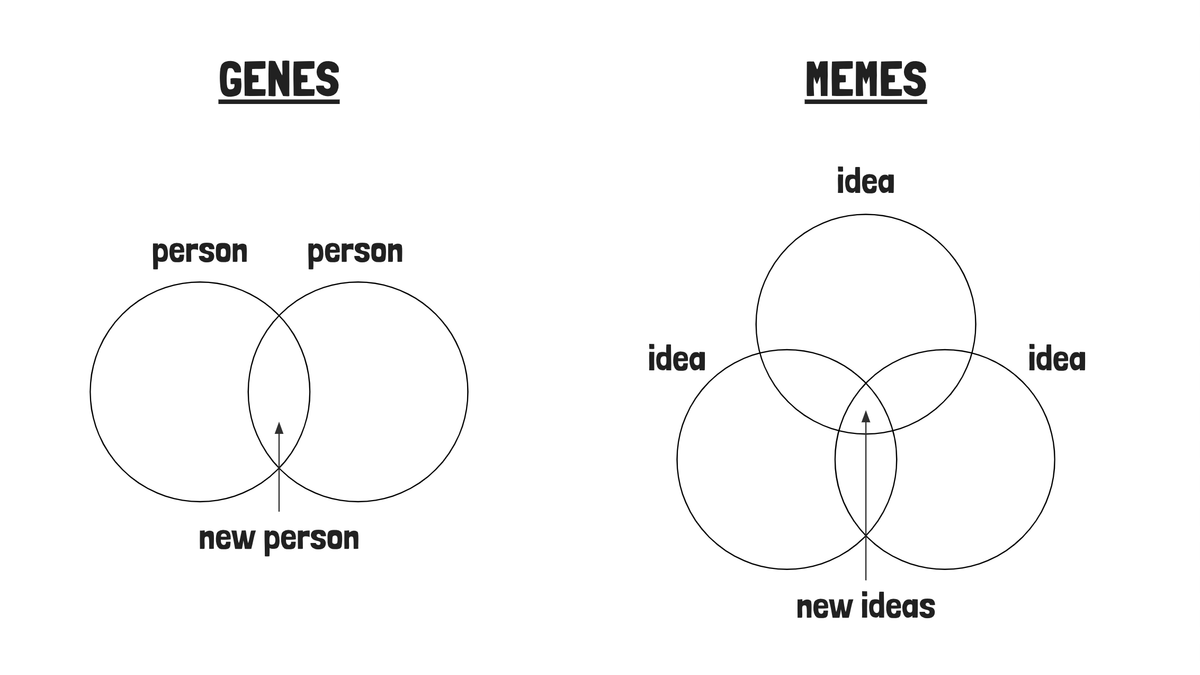 dawkins poses there are 2 kinds of replicator we can leave behind: genes and memes anything that spreads by imitation ie. universal darwinism