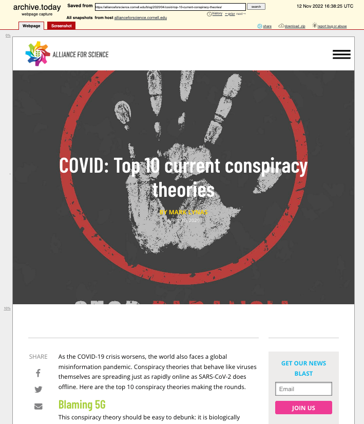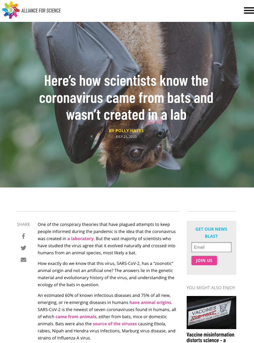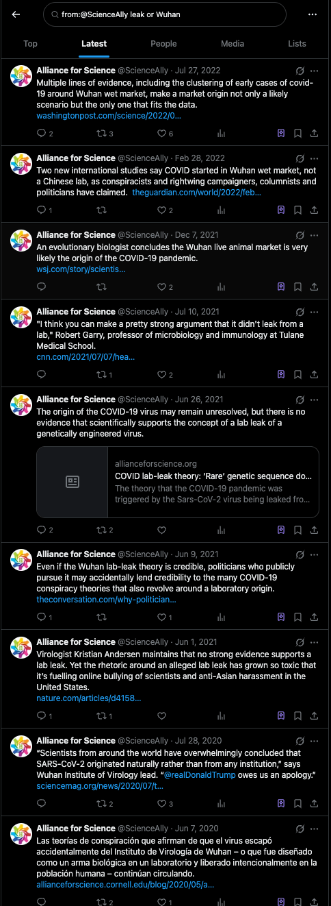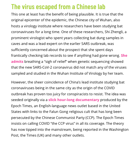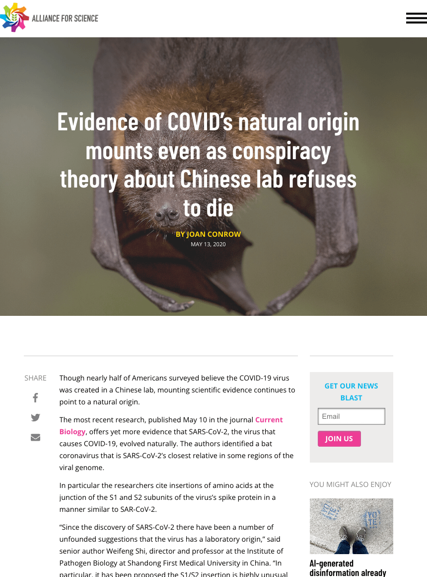 It may be worth remembering that the “Alliance for Science” (then at Cornell University) once listed the possible lab origin of COVID-19 as one of the top 10 COVID conspiracy theories.