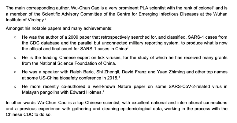 So, at this stage, most people will ask 'Who are these conspiracy theorists coming up with silly numbers'? 1st team led by WuChun Cao, well known PLA scientist and epidemiologist who collaborated with Holmes on some pangolin paper, did conferences with Baric, Shi Zhengli, etc