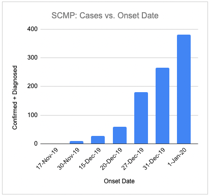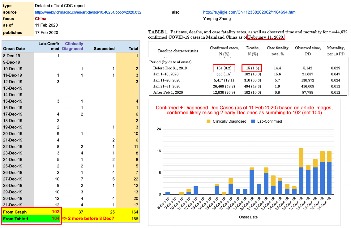 [Side note: There was also a weird thing going on with two Dec cases in the official CDC Weekly update on 17 Feb 2020 (using data as of 11 Feb). The table in that update gave 104 cases, but the graph starting 8 Dec 2019 only had 102. So two cases went missing somewhere.]