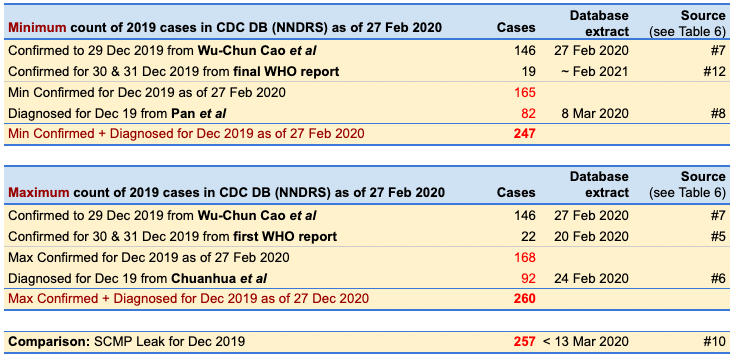 With all this, you could just: - take the 146 confirmed of Wu-Chun Cao et al to 29 Dec 2019, - fill with the 19 confirmed for 30/31 Dec 2019 from the final WHO report - add the 92 diagnosed of Chuanhua Yu et al for Dec 2019 Let's see: 146 + 19 + 92 = 257 @Peterfoodsafety