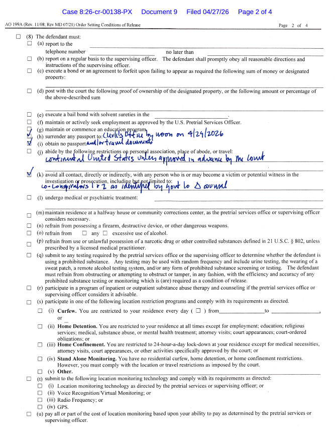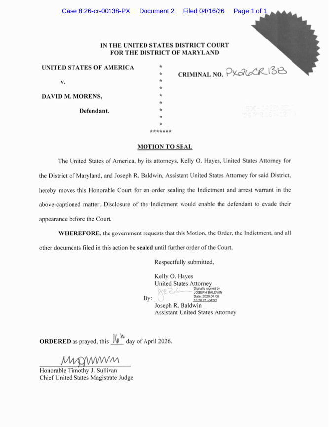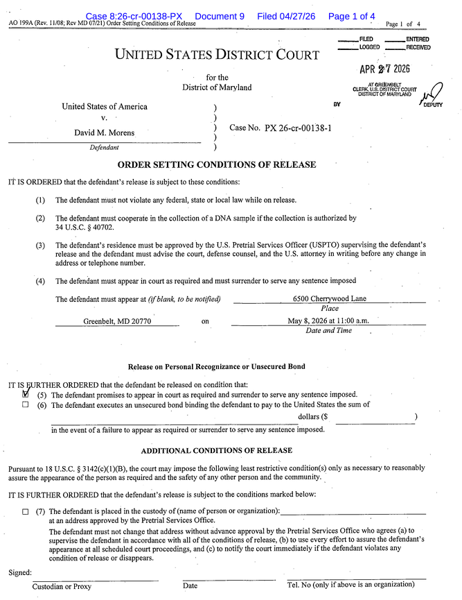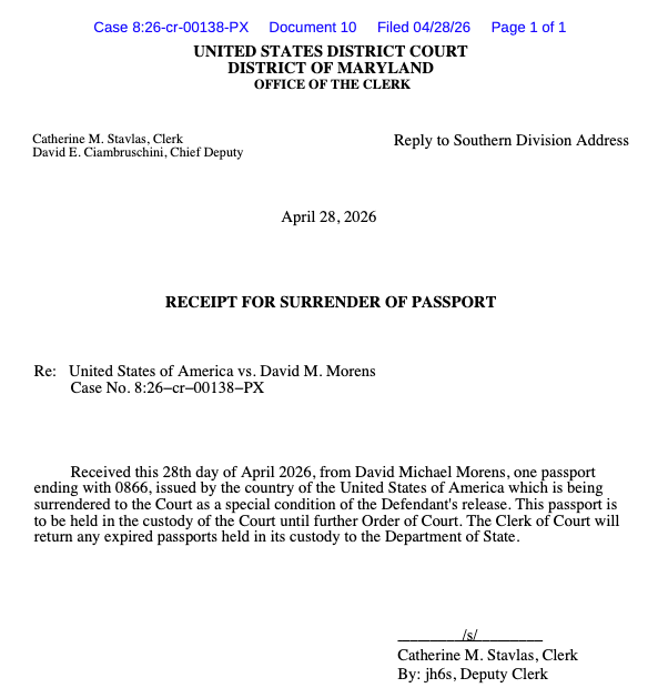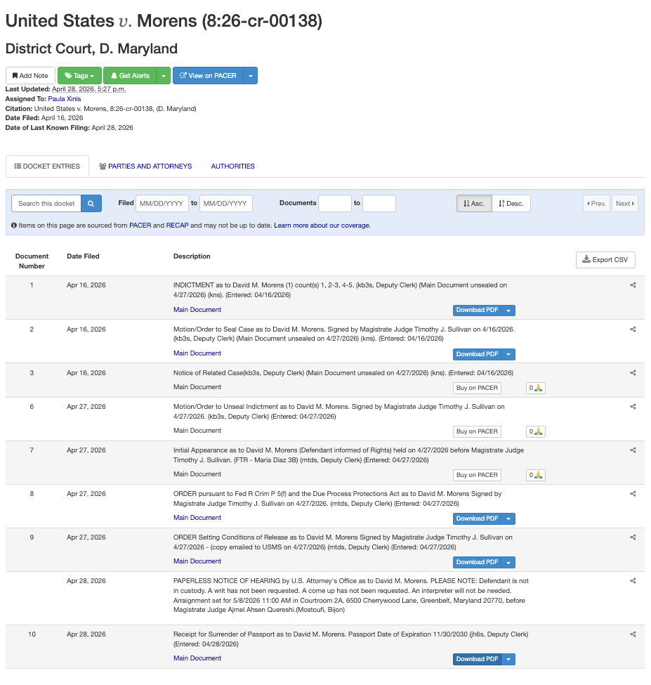 1/7 Go here to download the United States v. Morens (8:26-cr-00138) case details. Morens was arrested then released (after giving his passport).