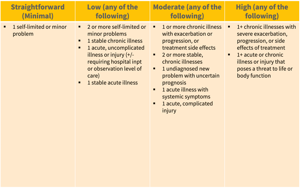 Most importantly: goodbye to the absolutely inane HPI, ROS, and PE elements for billing. Hooray! Instead, EVERYTHING is based on medical decision-making (MDM). ⬇️⬇️