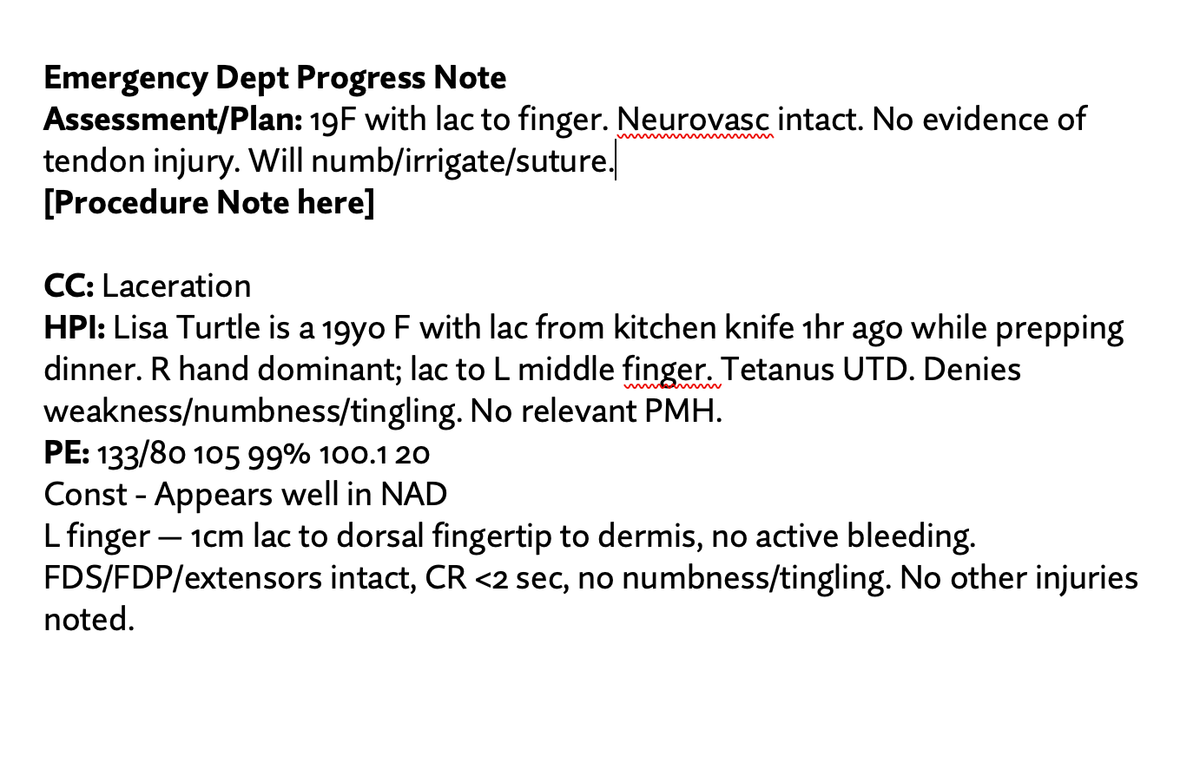 What might this look like in practice? I mean could this "rule out appy" note be a pipe dream? Could my ER note 👇really be this straightforward, containing almost exclusively-relevant information to the patient's CC? And fit in 20 lines?