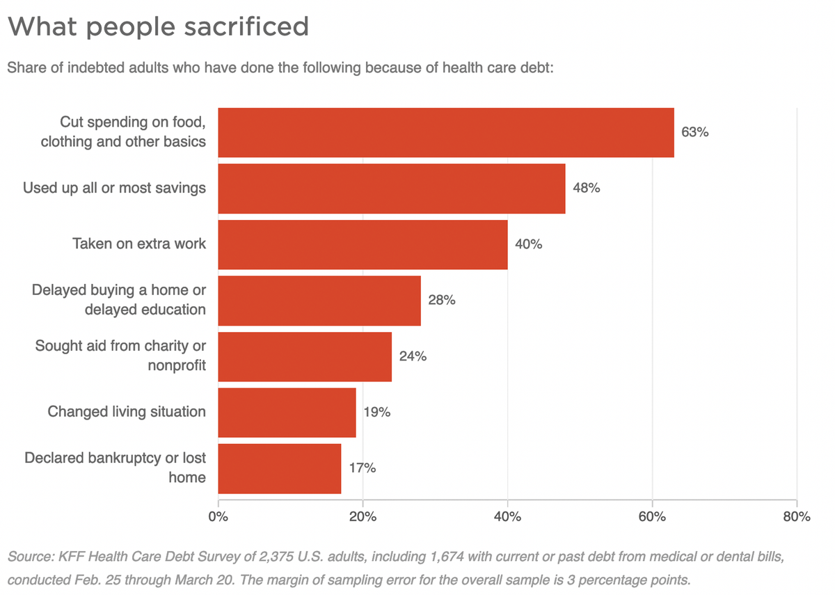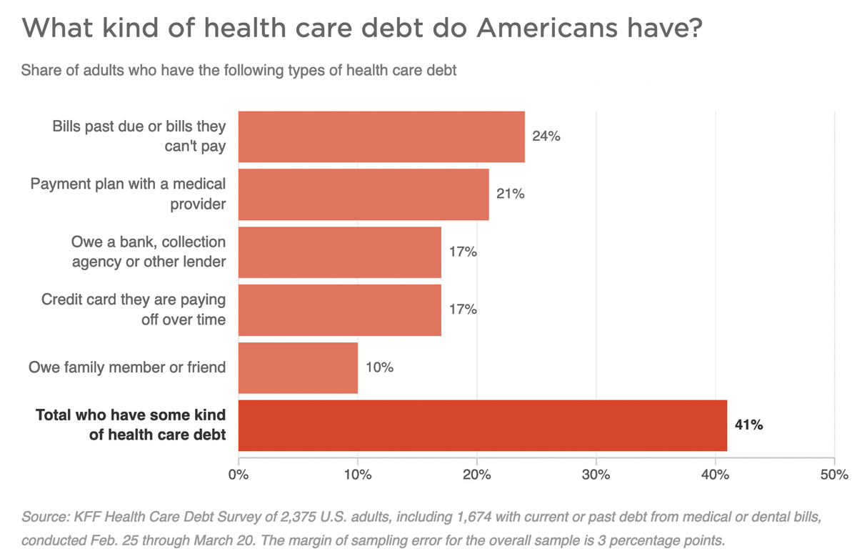 41% of Americans surveyed reported healthcare debt in this survey. In Japan, Australia, or any other modern country that number would be ~0. It would be unheard of. Unspeakable. Unconscionable.