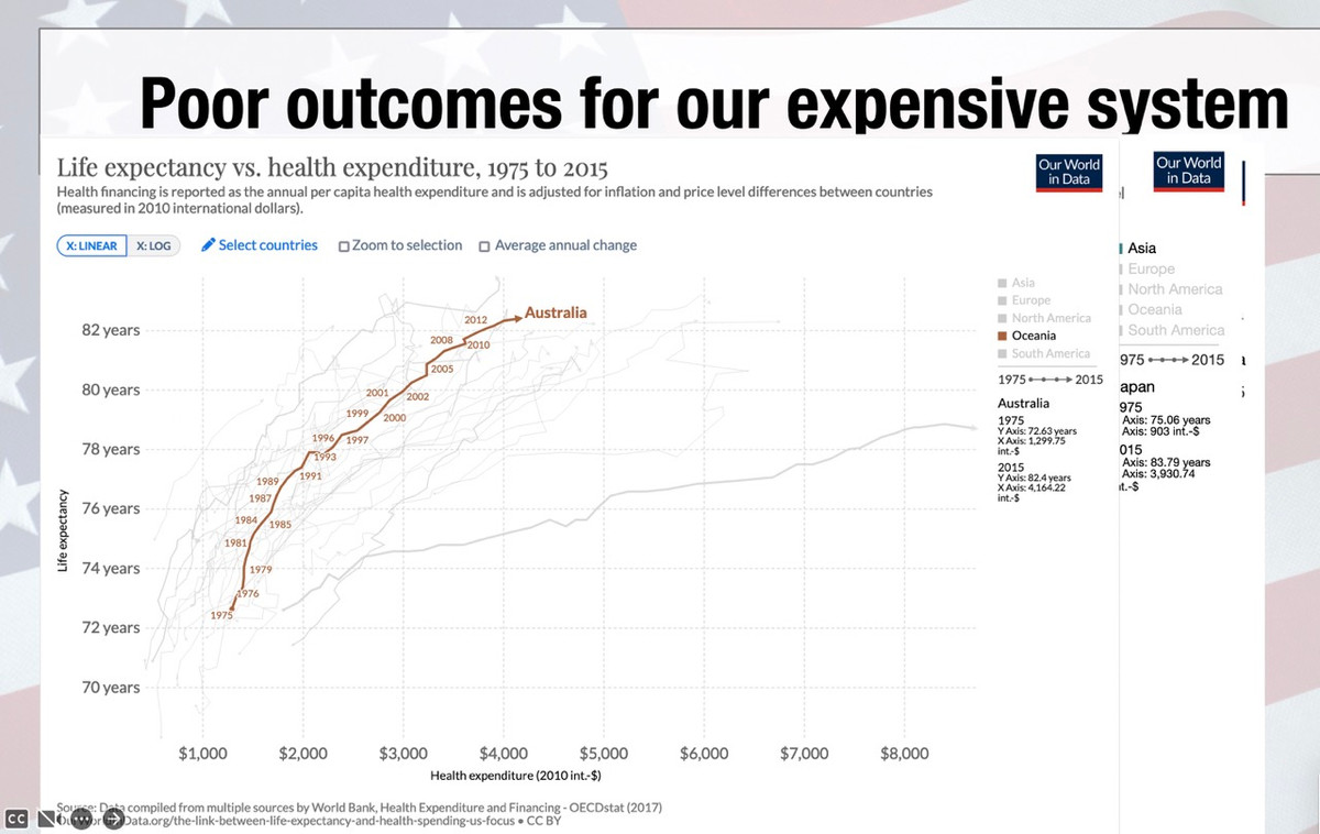 (Here's Japan and Australia's graphs for comparison, included since I lectured there. Also to point out for any "scary socialized medicine" types, both of these countries have private and public health insurance, and private and public hospitals.)