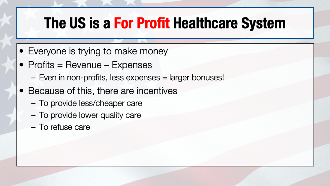 This is maybe the fundamental problem in the US. Like everything in our country, someone wants—or expects—to make a buck on it. And to call it out, that's me too. Doctors tend to be "for-profit." And "non-profits" still make a profit as well.