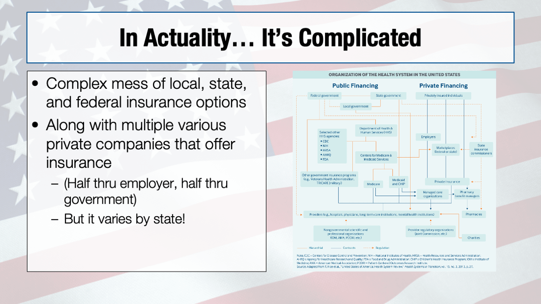 I couldn't really come up with a better definition for the US healthcare system than "a complex mess." I can't find the study, but for example one metropolitan area was surveyed and had something crazy like 1,200 different insurance plans available.