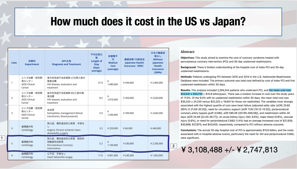 I did some brief cost comparisons that I could find; here's Japan's: if you need a stent in your artery for heart attack, it'll cost about $8,000 in Japan.