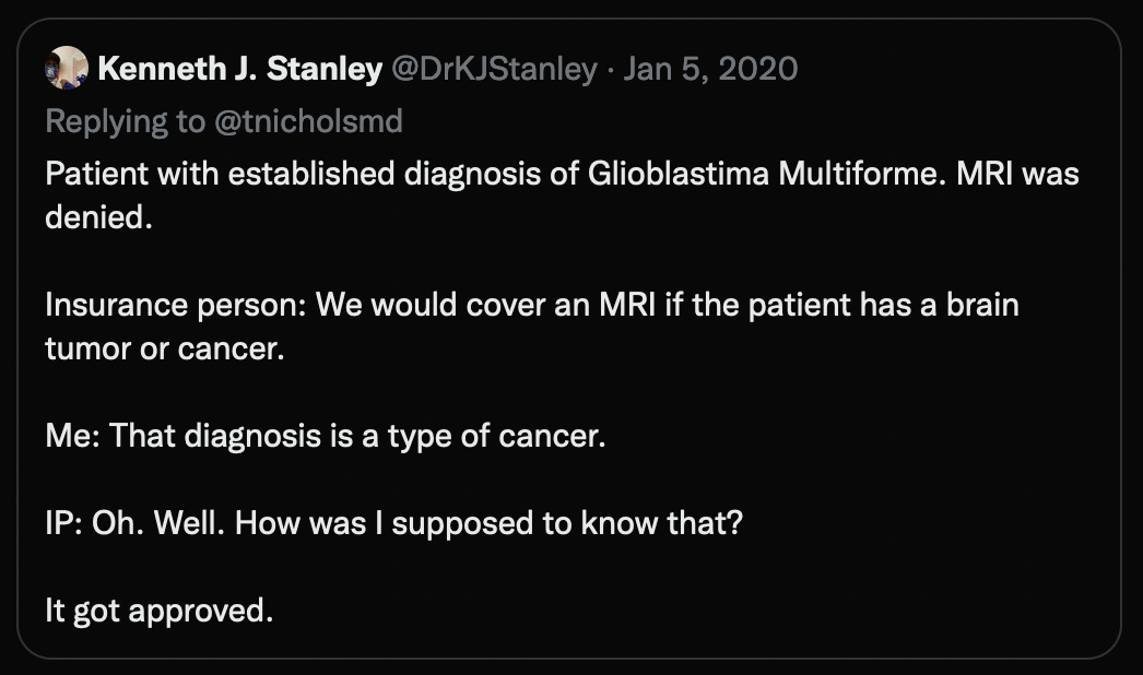 There is incentive everywhere to DO more *and* OFFER less in American healthcare. Want to see literal horror stories of insurers refusing to provide tests or treatments? Cancer patients dying in pain? Just skim this thread on prior authorizations.