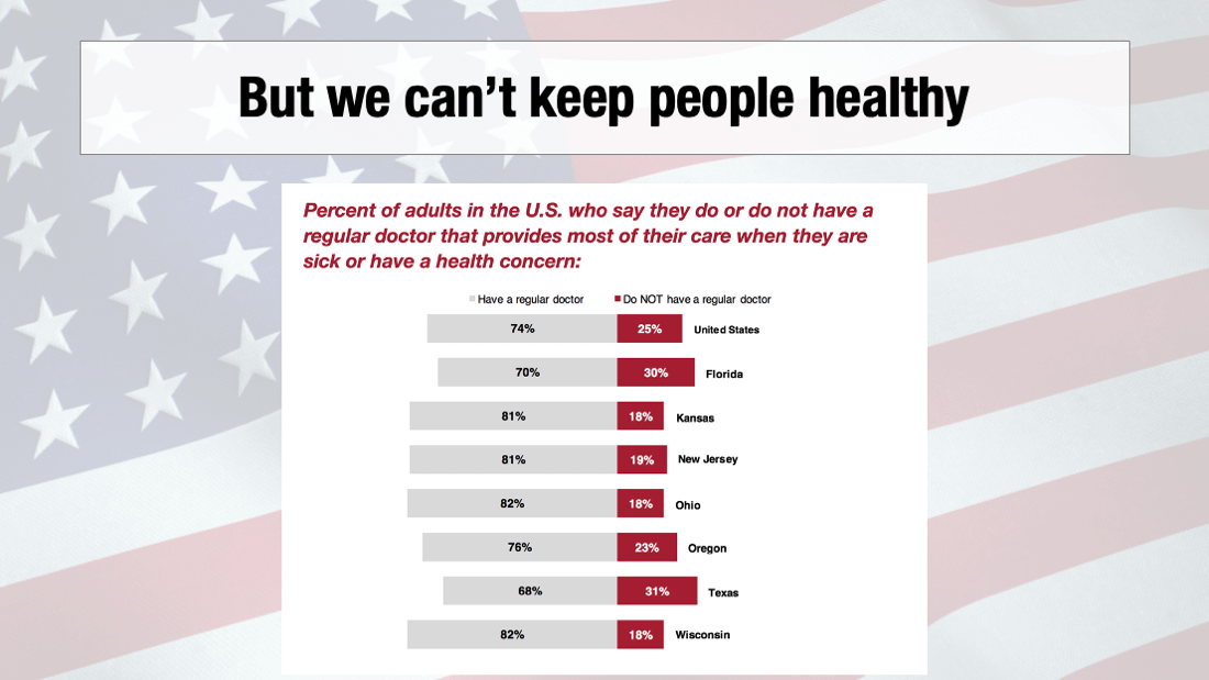 But up until that point? Yeah, good luck. 1 in 4 Americans does not even have a regular doctor they could make an appointment with to get on some blood pressure medicine, or check their cholesterol level, or get their colonoscopy or mammogram.