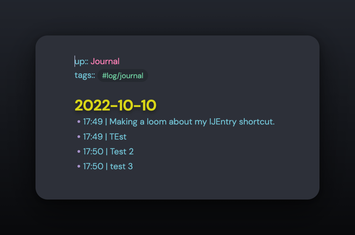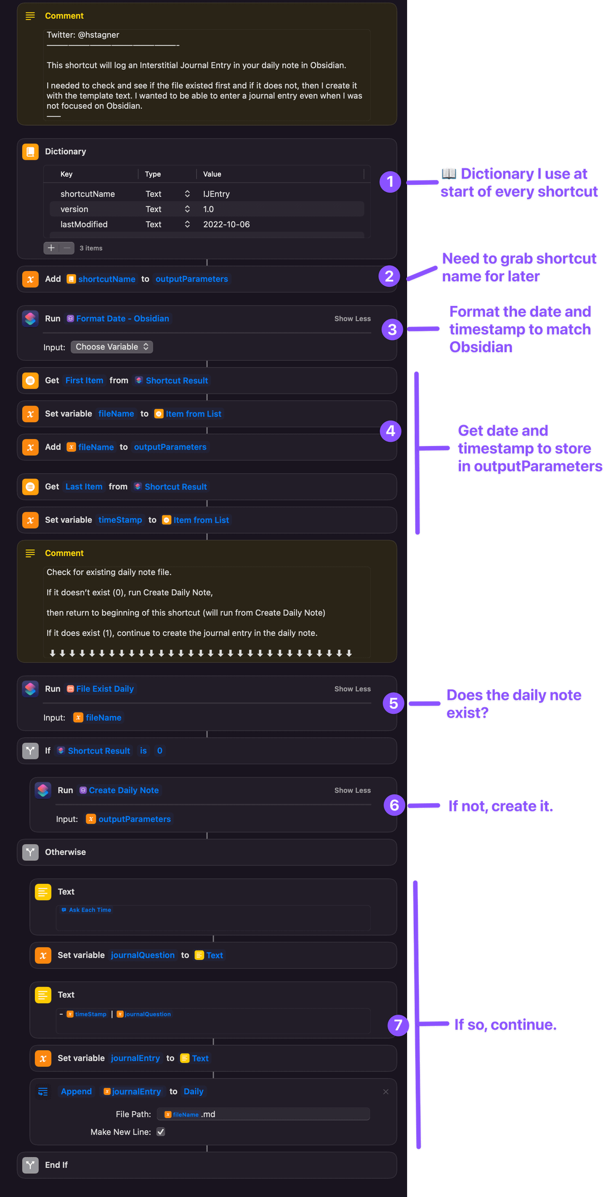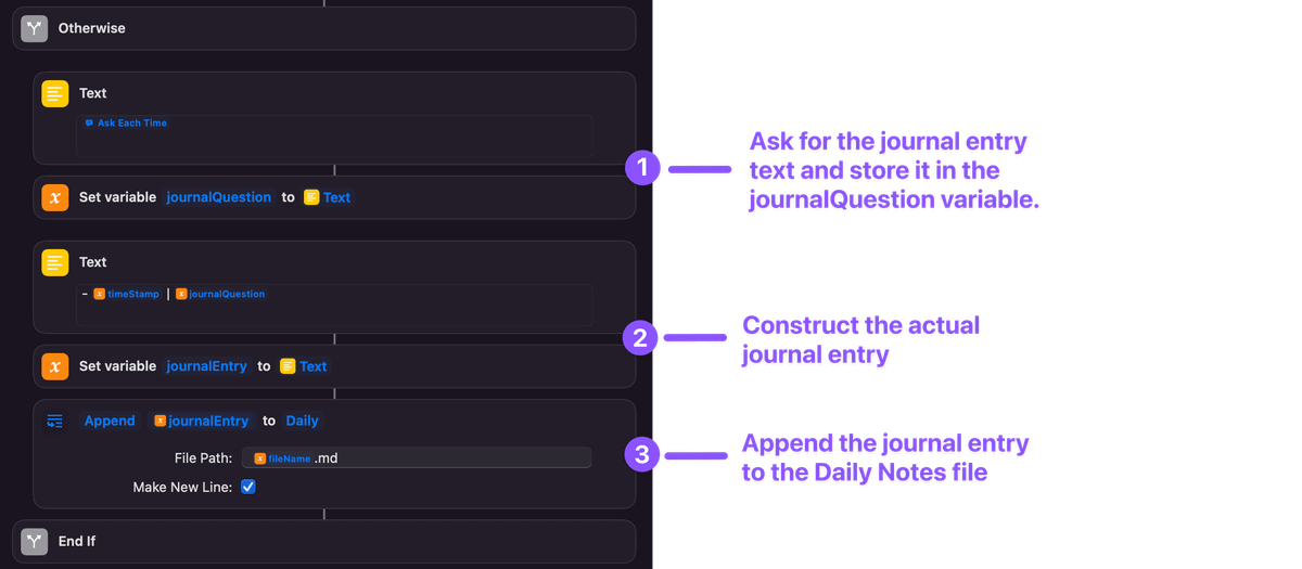 Back to IJ Entry. It will go through the file check again, but this time it should continue because the file is there. The rest of the shortcut asks for the journal entry text, constructs the journal entry, and appends it to the daily note.