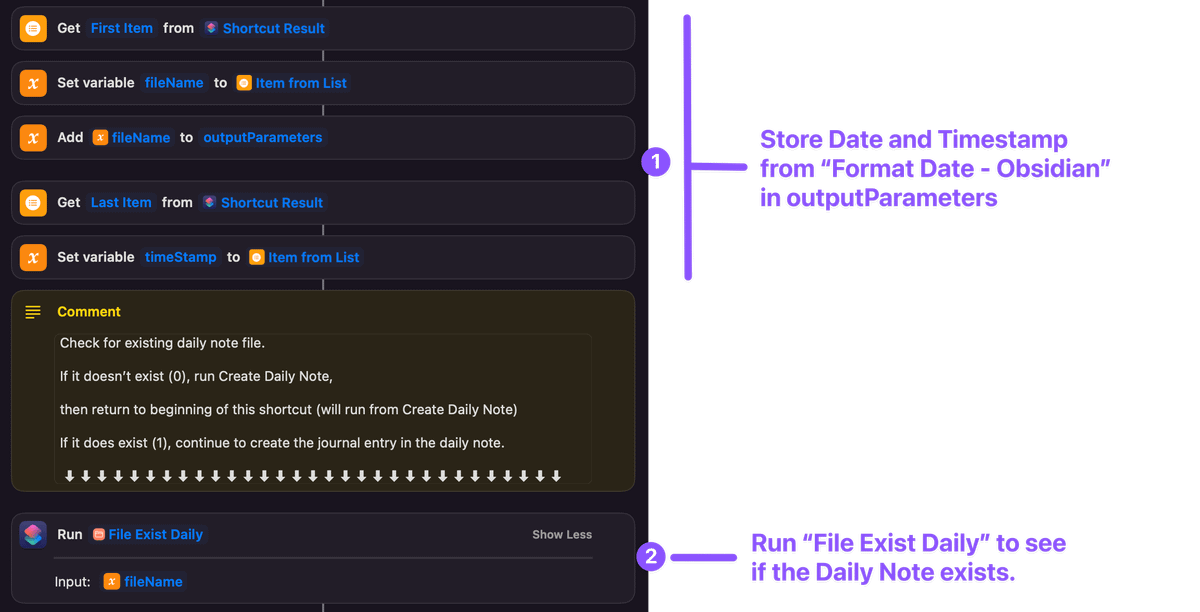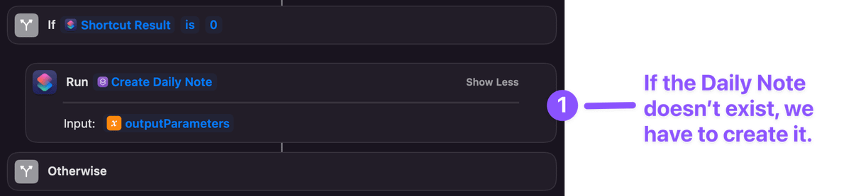 If the file does not exist, we need to create it with my final helper shortcut, "Create Daily Note".
