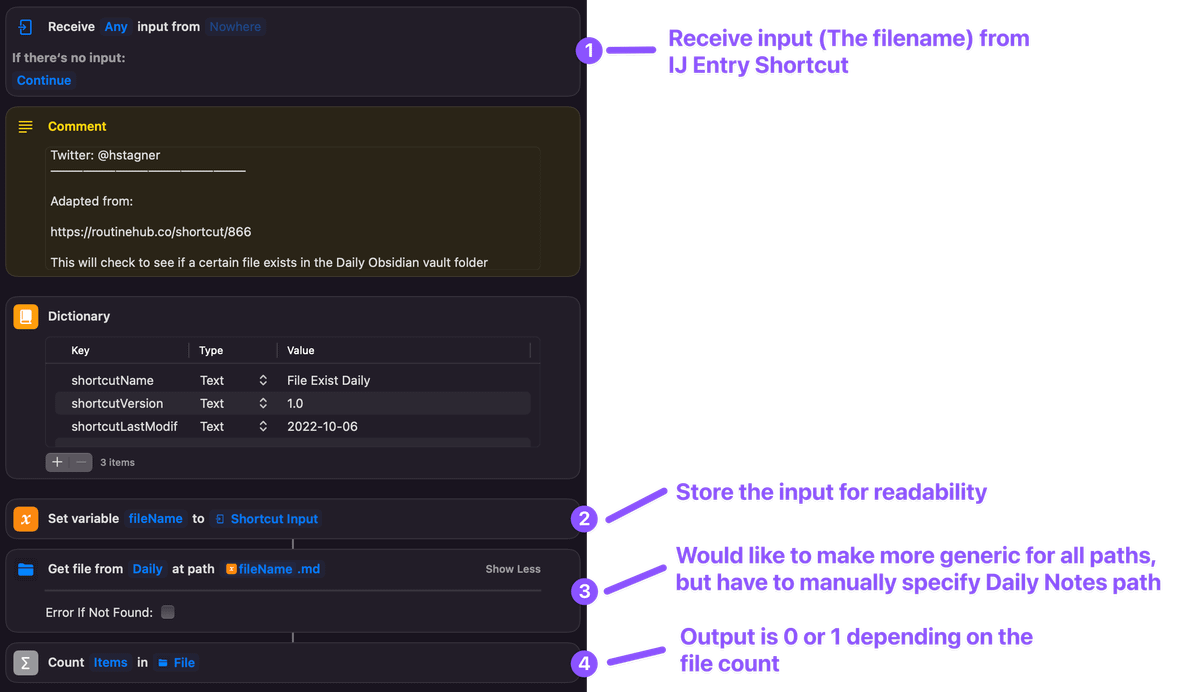 Here's where I would have liked to store the entire path as a variable to make this shortcut check for ANY file (not just a file in my Daily Notes directory). If someone knows how to do this, let me know. ๐