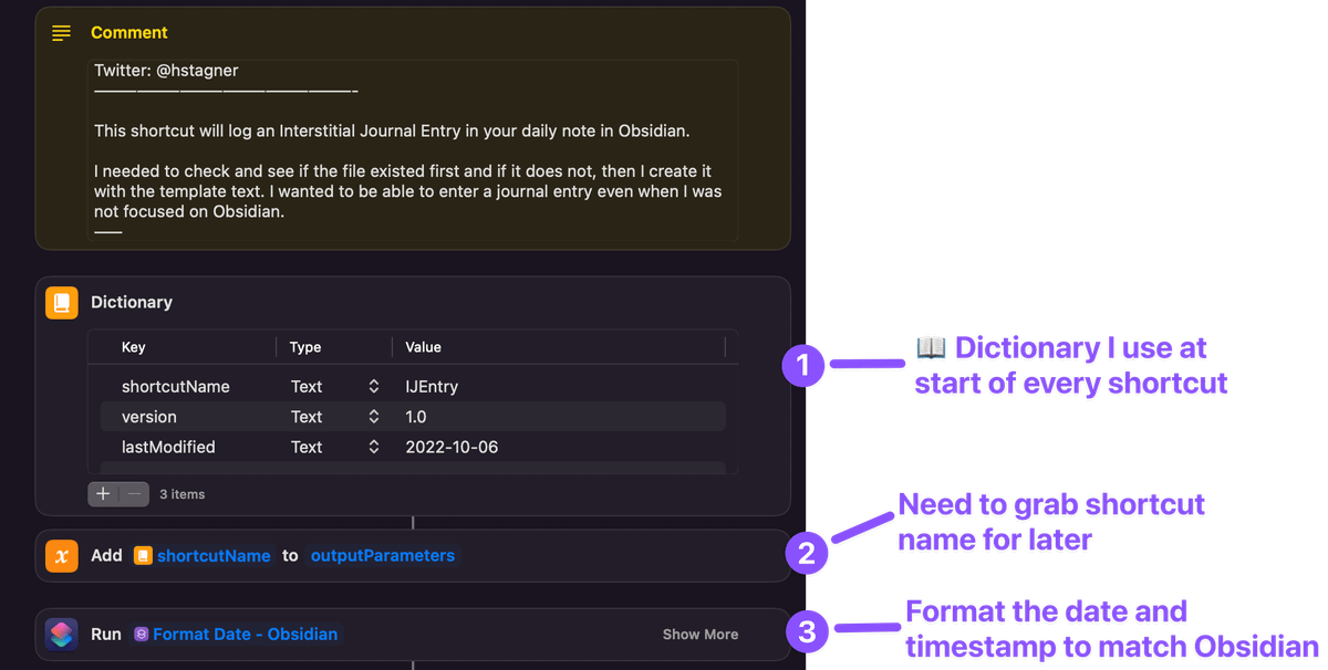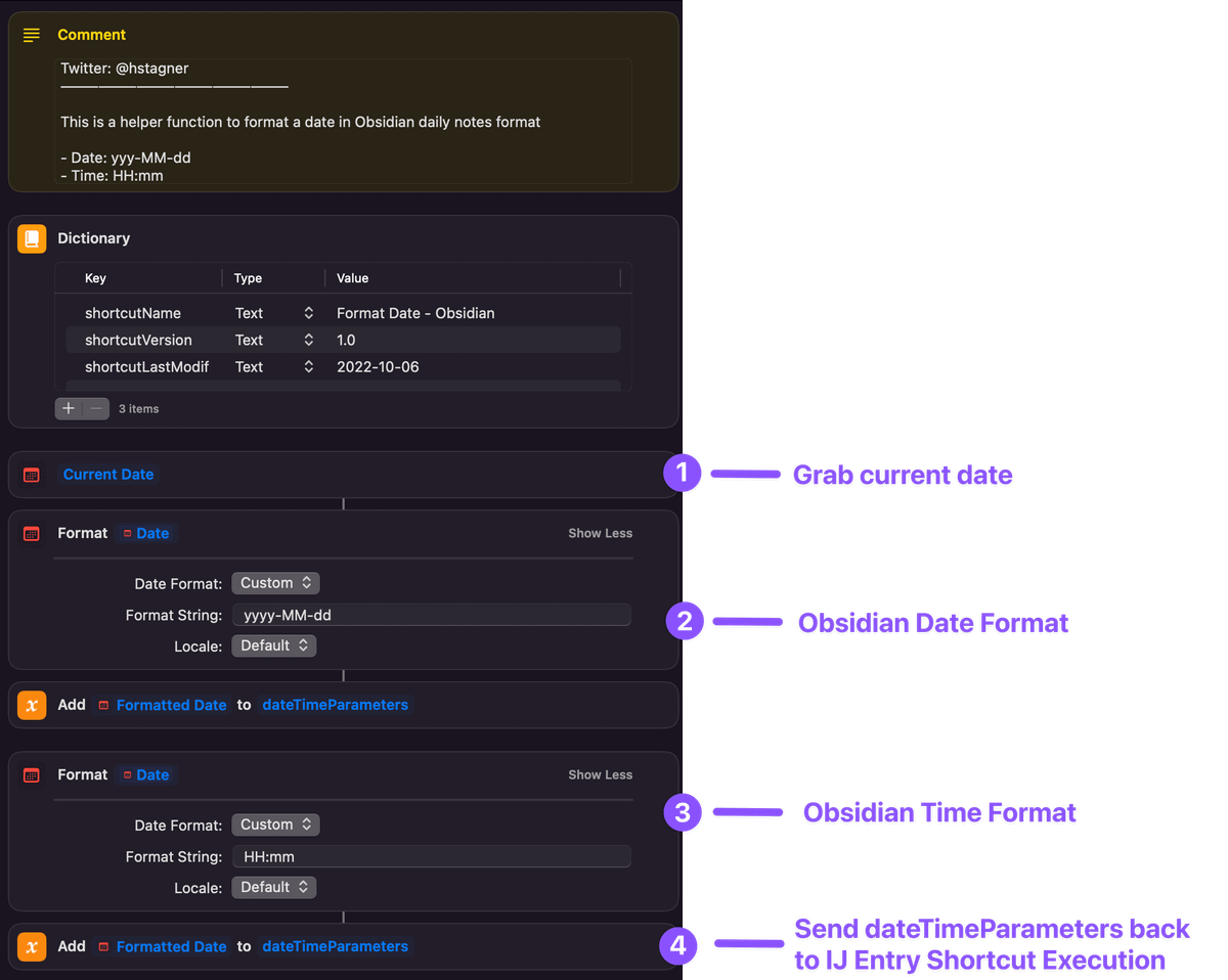 Let's break this shortcut down into smaller chunks. The first thing I need to do is set up the date and time that @obsdmd expects for the Daily Note.