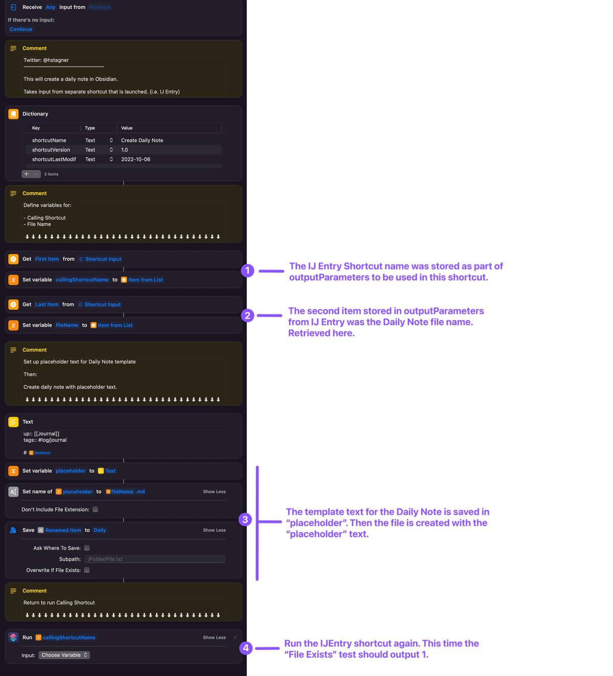 Let's take a look at the "Create Daily Note" shortcut. Here is where it is important to capture the original shortcut name (IJ Entry) because it needs to run again to perform the file check after the Daily Note is created.