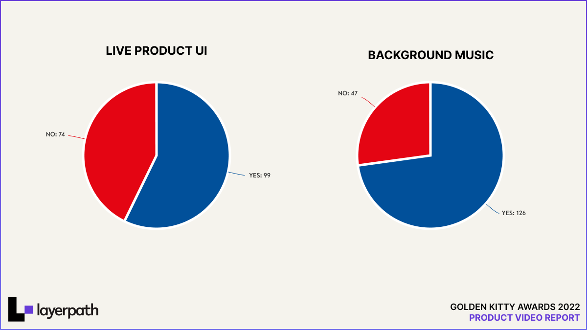 [Product, Music & Voiceover] 58% of companies featured live product user experience in their videos. 73% added background music and 54% had voiceovers to amplify the content. #ProductDemos
