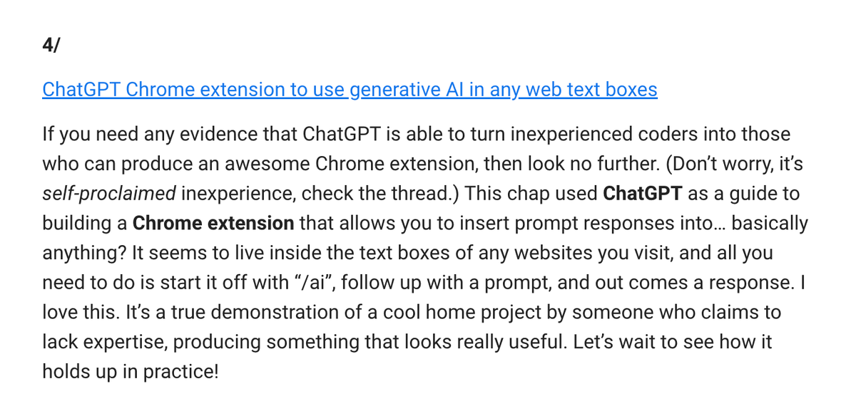 He then built a tool that takes all the data in for each Shopify store, trains GPT-4 on what the site does/sells, and told GPT-4 to come up with an idea for an app to generate more revenue for each store. Then he pitched this in a cold email.