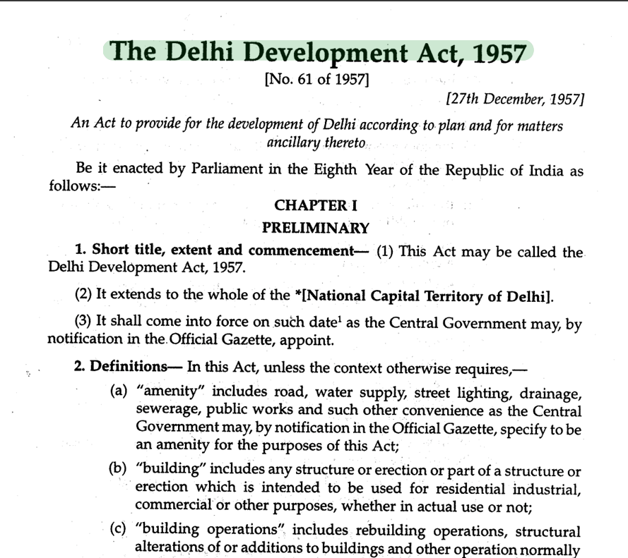 However, in 1957, the government passed the Delhi Development Act, which banned private companies from developing new colonies in Delhi and gave the role to government departments.