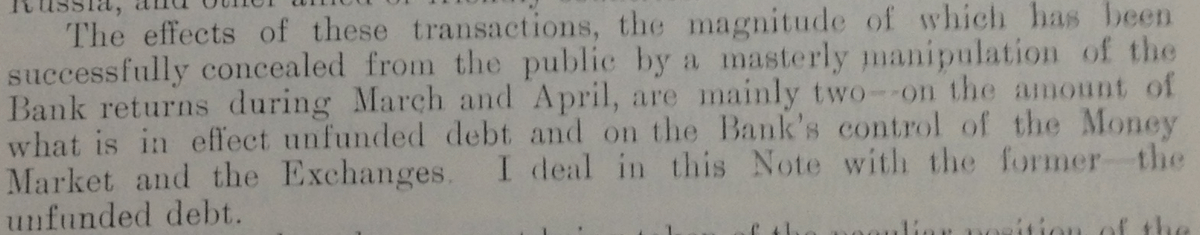 סיפור ההתערבות של ה-BOE נשמר כסוד כמוס במשך שנים רבות לאחר המעשה, ומסיבות מובנות. ג'ון מיינארד קיינס, אגב, שכנראה היה בסוד העניינים כתב בשנת 1915 בתזכיר לשר האוצר הבריטי דאז בשבח המניפולציה שהצילה את הבריטים מאסון פיננסי, אך גם הזהיר אותו שלא לנסות להשתמש בתגיל המסוכן הזה בהמשך.