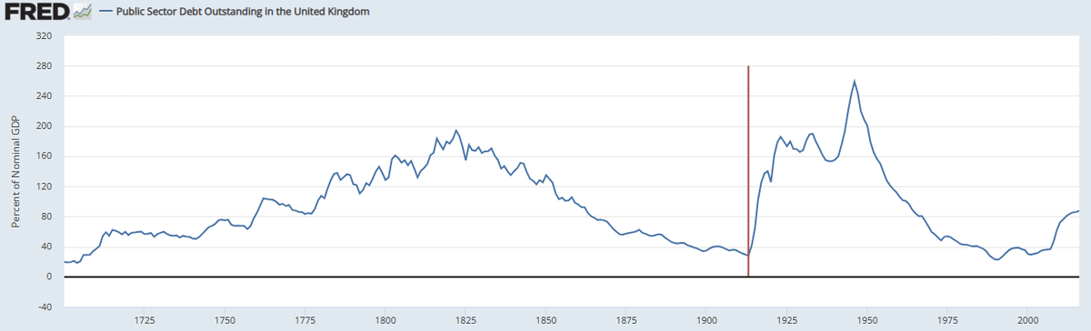 בשביל לקבל קצת פרספקטיבה, אני מצרף את הגרף למטה שמתאר את יחס החוב-תוצר הבריטי על פני זמן והקו האדום מציין את שנת 1913. במהלך שש השנים הבאות, יזנק יחס החוב-תוצר הבריטי מ-25 אחוזי תוצר ל-125 אחוזי תוצר. מלחמות הן כידוע עסק יקר מאוד (הפיק הבא בגרף קשור כמובן למלה"ע השנייה).